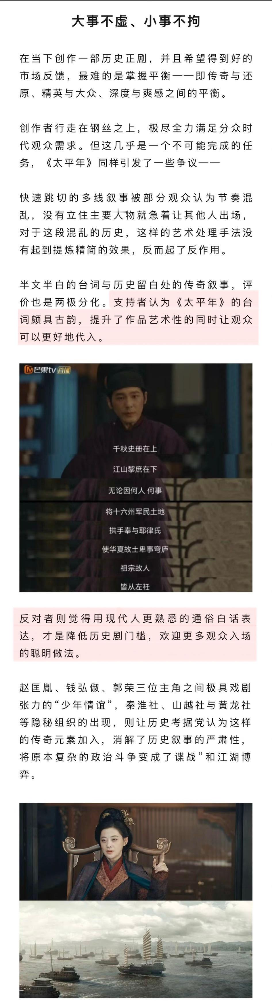 被太平年里的少年意气燃到 历史正剧怎么拍才能让观众满意 历史正剧,并且希望得到好的市场反馈,最难的是掌握平衡——即传奇与还原、精英与大众、深度与爽感之间的平衡。你觉得《太平年》是否掌握了平衡?娱理锐评↓