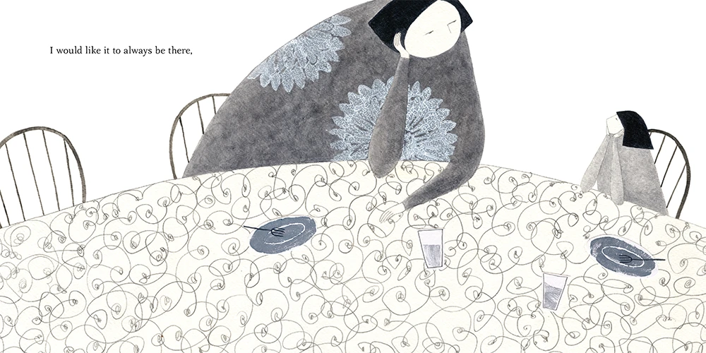 文字以孩童单纯的语言,描写面对亲人逝世的叹息和诚恳想望,看似轻巧地刻画你我心中哀伤的情感,娓娓道出抽象的生死议题。