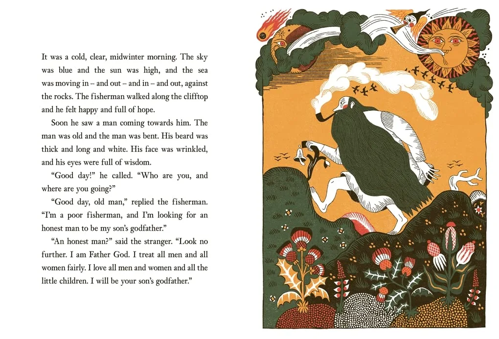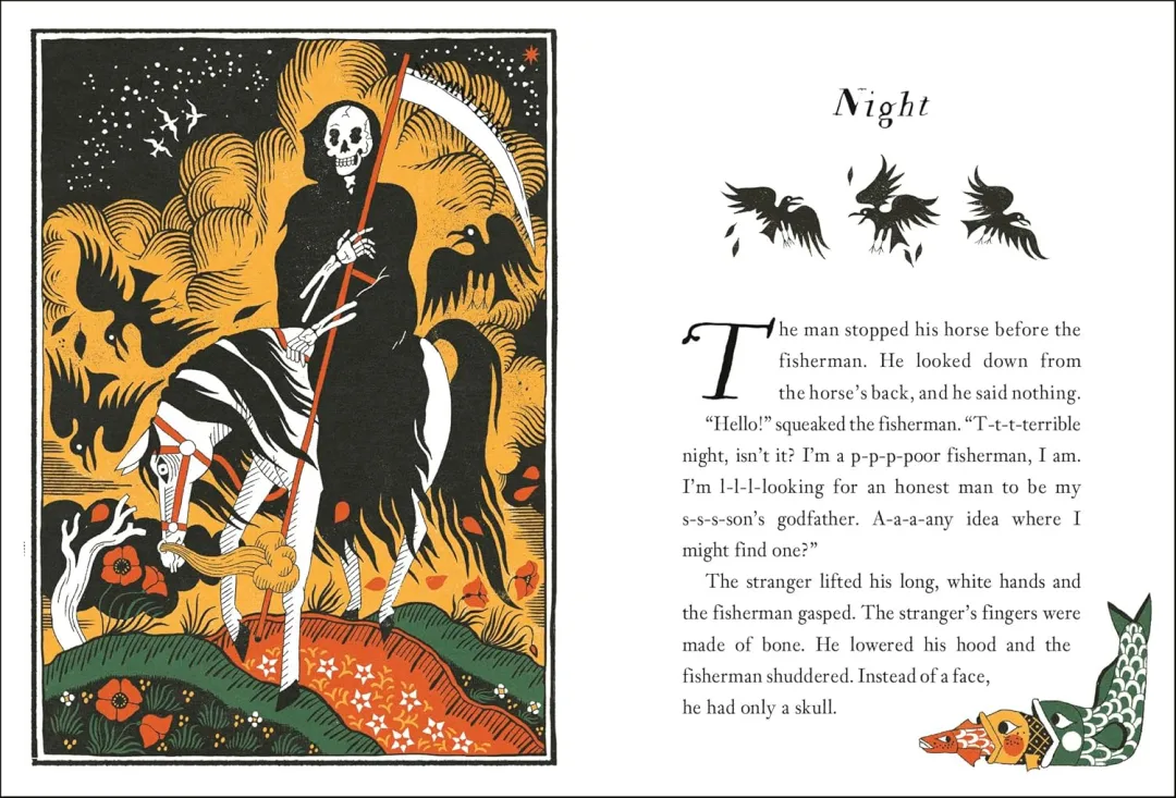 贫穷的渔夫选择死神作他儿子的教父。他相信这是正确决定,因为谁都不比死神诚实。在孩子受洗时,死神送给渔夫一份礼物,这礼物原本可使渔夫家致富,渔夫却因为贪婪欺骗了死神,因而尝到恶果。