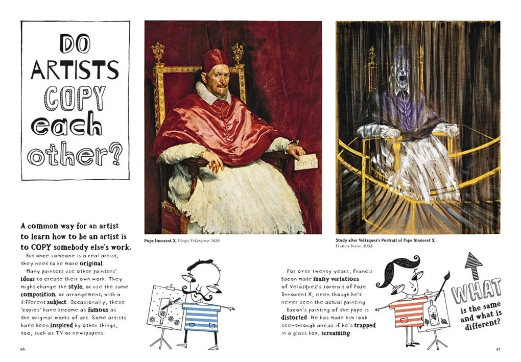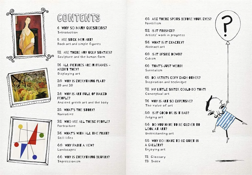 艺术家苏西.霍奇为喜欢艺术却觉得自己不得其门而入的读者,设计了二十二道问题,幽默、轻松的语调,引领读者逐步开始认识各种艺术,包括从洞穴壁画到立体主义,从文艺复兴到当代艺术,探讨不同流派、不同主题──包括静物画、风景画和肖像画等等──以及关于艺术在我们生活中的作用和价值。每个问题都以两页图文来解答,深具启发性的方法,使艺术入门者能更自信地提出问题、寻找答案,并为自己「阅读」艺术。