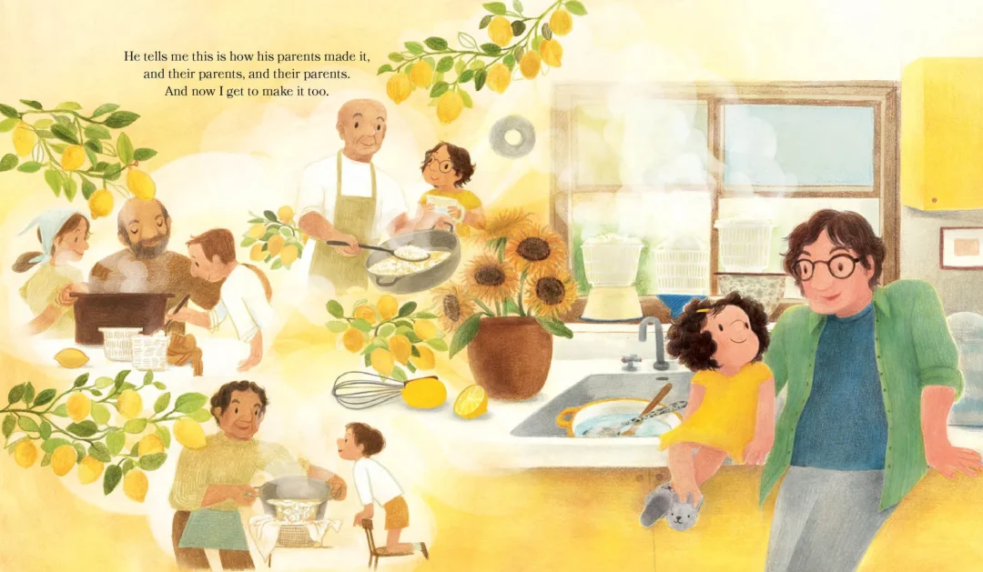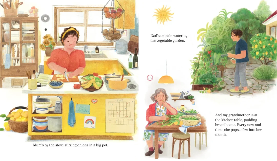 朱莉娅以细腻温柔的笔触,将家庭周日的小仪式(烹饪、协作、分享)娓娓道来,让 “平凡时光” 充满诗意;插画师米奥・严则用鲜活温暖的色调,还原出柠檬树下的餐桌、厨房中忙碌的家人、孩子捧着热蛋糕时亮晶晶的眼睛,让亲情的联结与美食的温度跃然纸上。