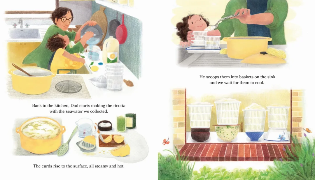 故事围绕一个孩子记忆中特别的 “星期天” 展开,字里行间满是家庭烹饪的香气与声响:清晨厨房传来的切菜声、烤箱预热的细微嗡鸣,混合着柠檬的清新与面粉的麦香;孩子跟着家人一起,开启充满趣味的 “美食冒险”—— 去收集海水制作乳清干酪,指尖沾染的盐粒、耳边的海浪声,让平凡的食材收集变成独特的体验;更有 “学会烘焙家族特制苹果蛋糕” 的成长时刻,从揉面、放料,到看着蛋糕在烤箱中慢慢膨胀、散发甜香,每一步都是满满的成就感。