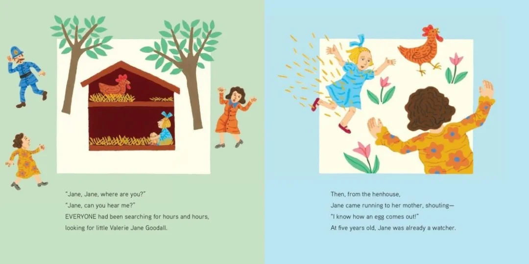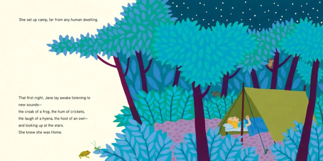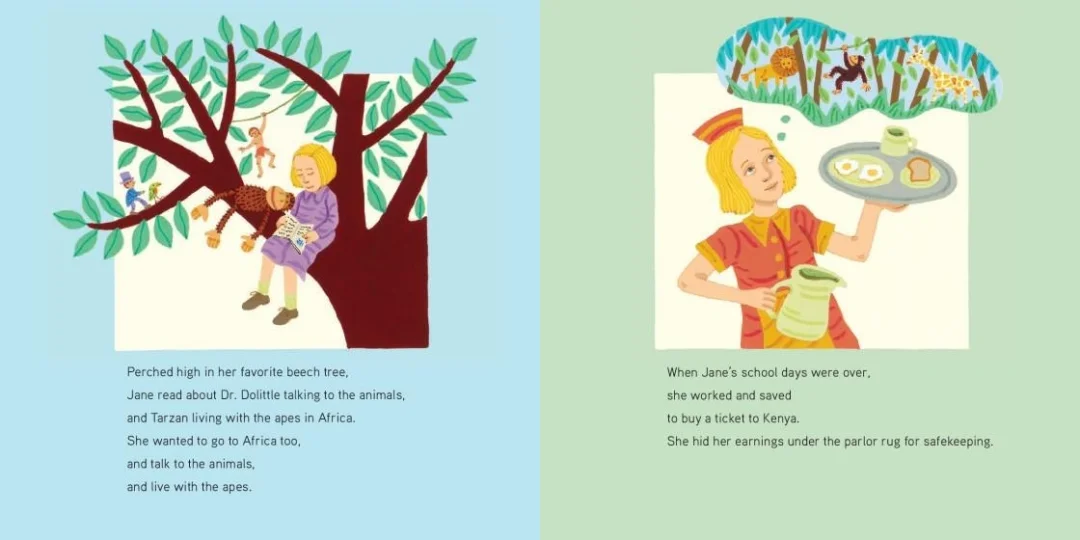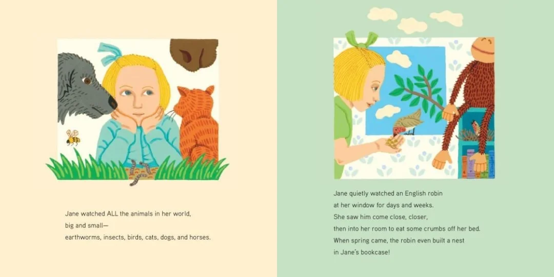 故事从珍在伦敦的童年讲起 —— 她趴在窗台上静静观察一只知更鸟,哪怕长时间等待也不烦躁。这一细节并非偶然:它埋下了 “耐心观察” 的种子,暗示了她日后能在非洲森林中坚持数年研究黑猩猩的性格底色,让小读者明白 “科学的兴趣往往始于对日常生命的关注”。