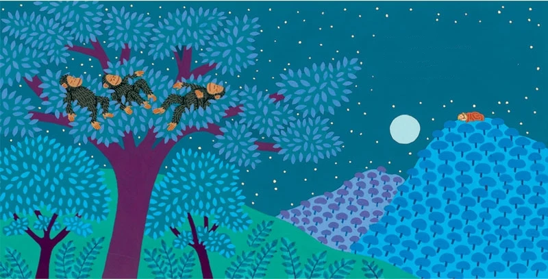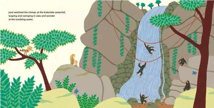 成年后,珍受到著名科学家路易斯・利基(Louis Leakey)的邀请,前往坦桑尼亚的贡贝溪国家公园(Gombe)。绘本没有堆砌复杂的科学术语,而是通过画面呈现她的日常:穿着简单的衣服穿梭在森林里,学着黑猩猩的叫声与它们建立信任,第一次发现黑猩猩会用树枝 “钓” 白蚁(这一发现颠覆了当时 “只有人类会使用工具” 的认知)。这些场景让 “野外研究” 变得具体可感,而非遥远的概念。