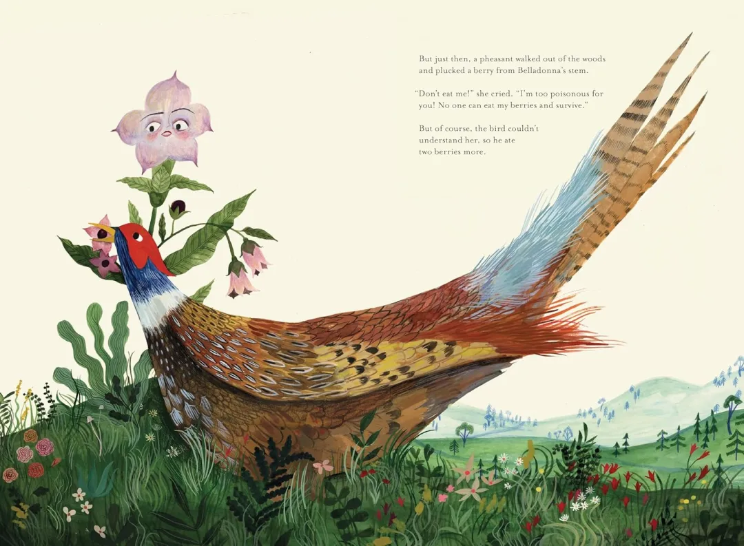 在这个过程中,它遇到了森林里形形色色的 “导师”:有懂得用特殊气味驱赶天敌的草本植物,有依靠坚硬外壳保护种子的灌木,还有会通过 “合作” 吸引昆虫传播花粉的花朵;最后,一只优雅的雉鸡更是点醒了它 ——“生存从不是一个人的事”。终于,颠茄慢慢发现了自己的 “隐藏能力”:它体内蕴含着独特的化学物质,这些物质能让啃食它的动物望而却步。