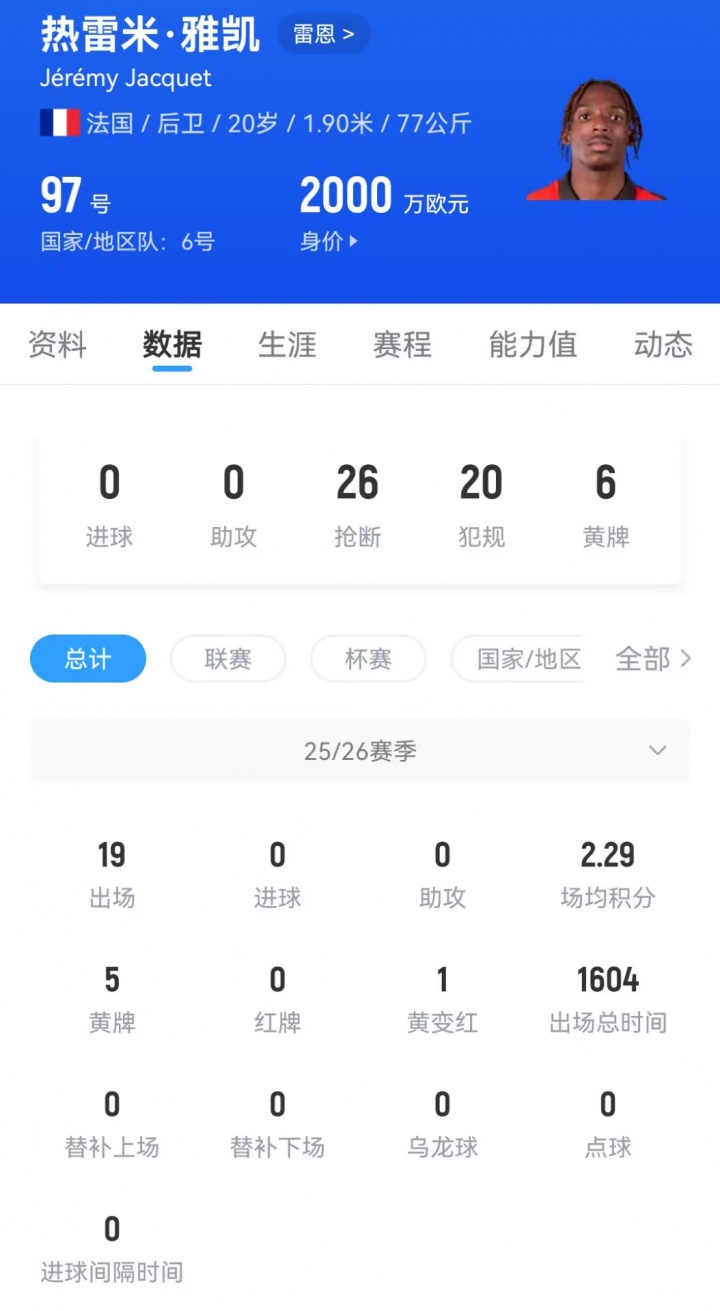 20岁的雅凯德转身价仅2000万欧,这名中后卫现效力法甲雷恩队。
