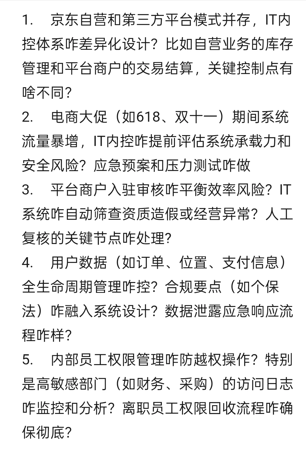 1. 京东自营和第三方平台模式并存,IT内控体系咋差异化设计?比如自营业务的库存管理和平台商户的交易结算,关键控制点有啥不同?