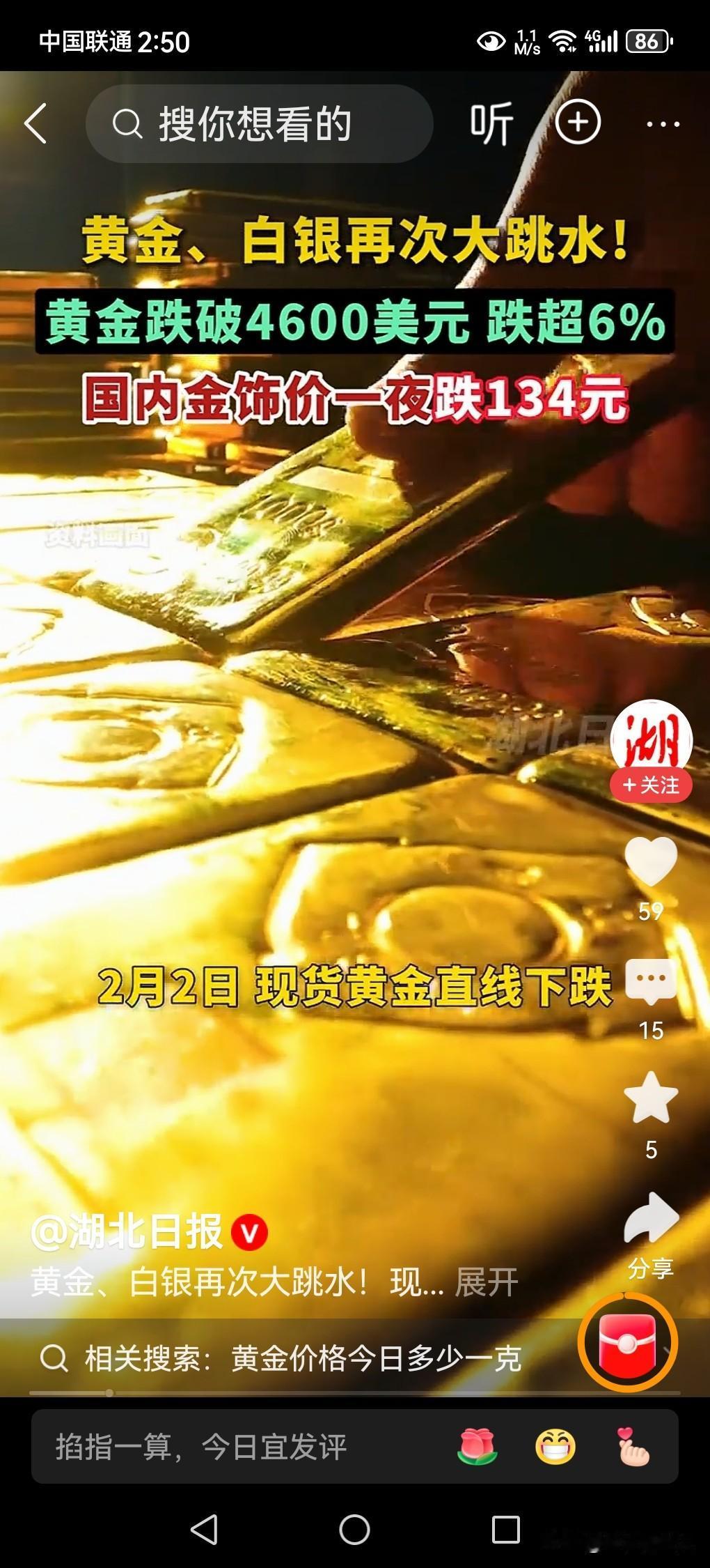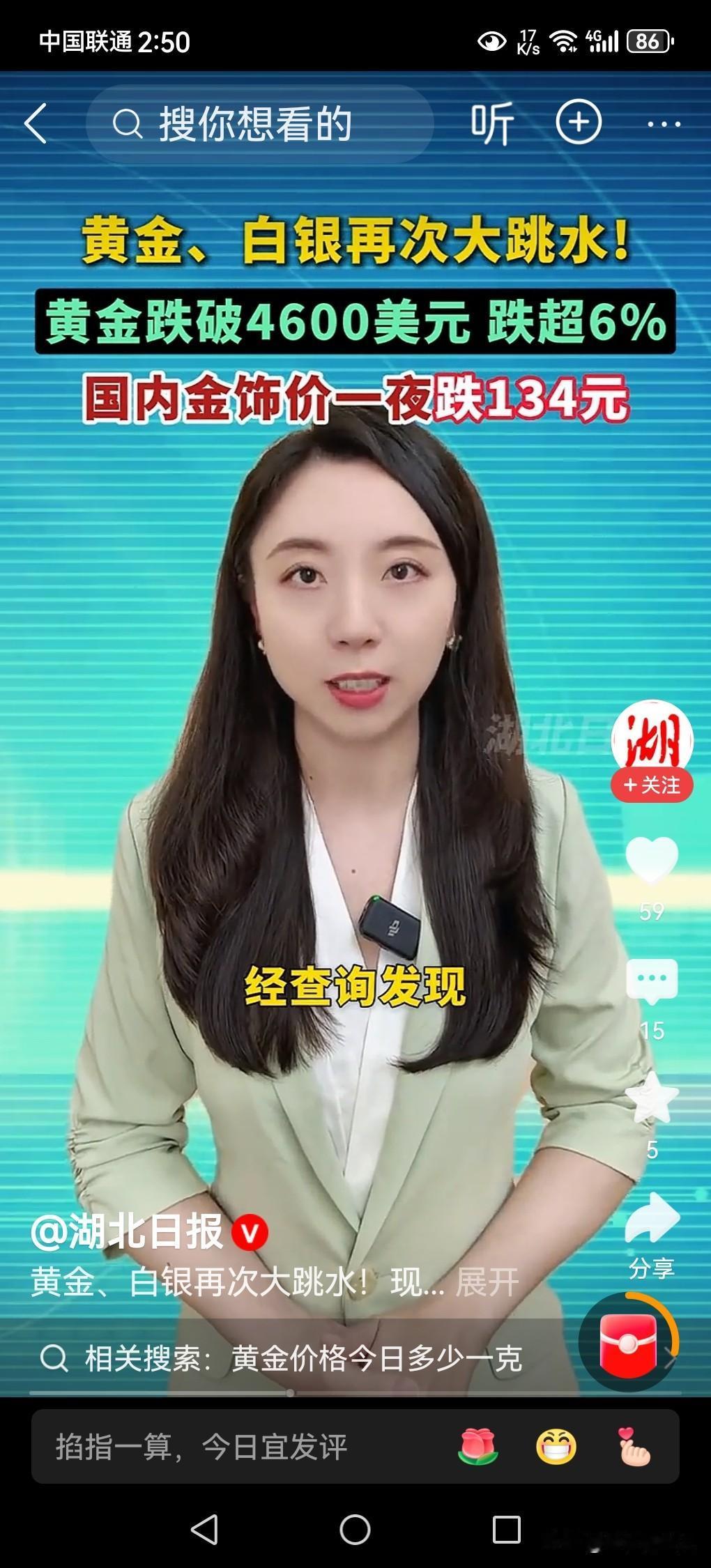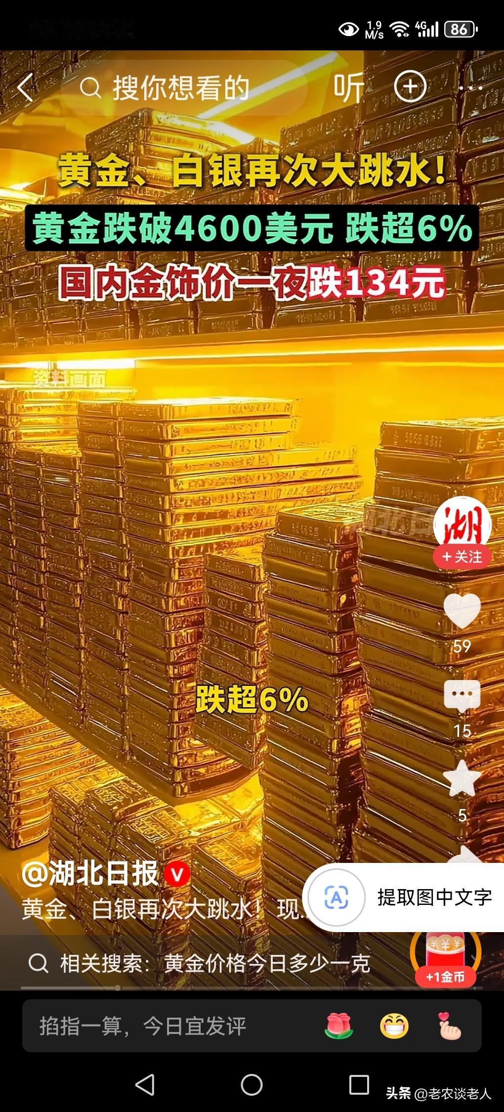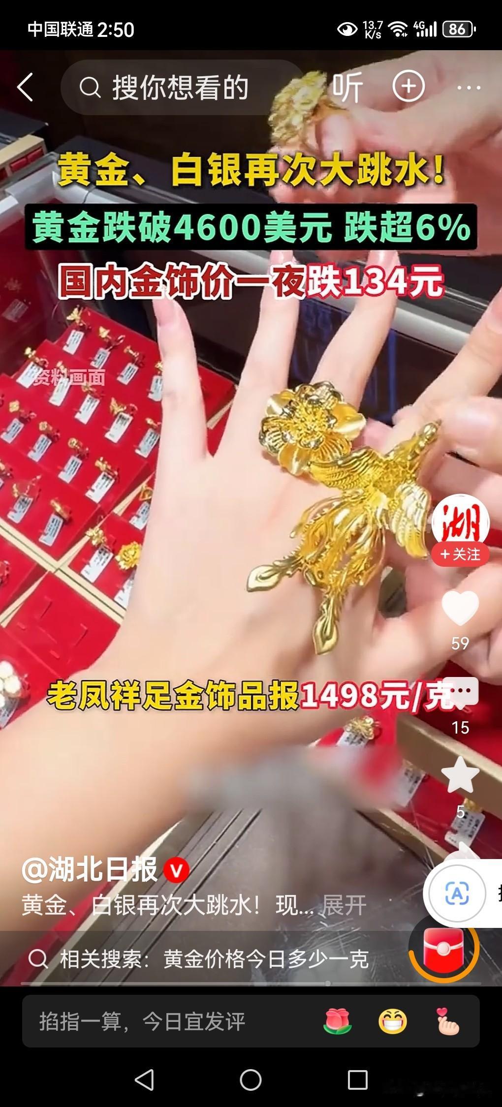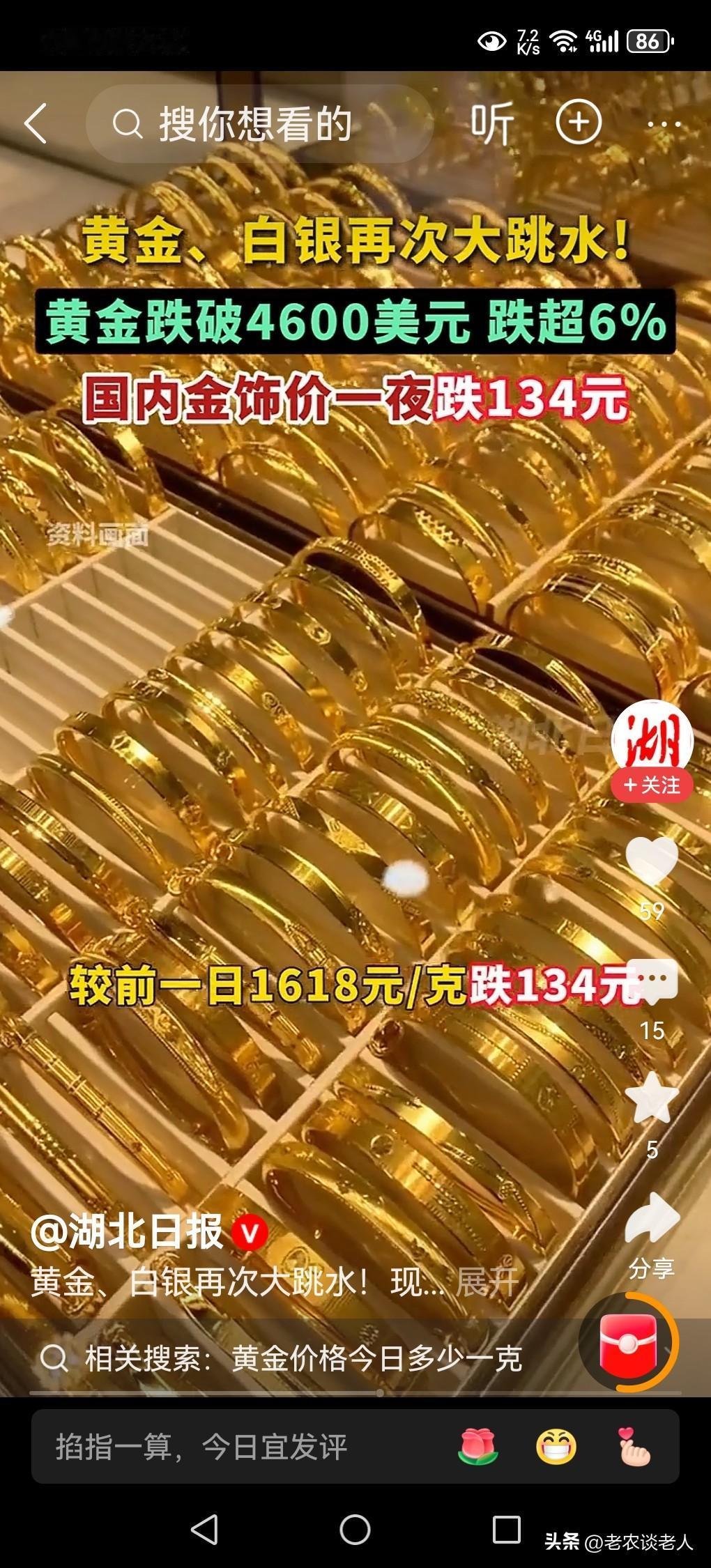 昨天购买的金项链今天就掉价134元/克! 本人老伴结婚时购买的金项链,在十几年前被小偷偷走后,多年想重新购买一条,都因手头紧,舍不得花钱,没有实现这个愿望。 现在人老了,有了退休金,加上近段时间黄金价格大跌,老伴非常动心,认为现在金价在下跌,估计金价不会再跌,以后还会要上涨的。她想要买一条金项链,就赶紧趁黄金价格下跌的时候,购买一条来实现早年没有实现的心愿。 于是昨天在金店里选择了一上午,终于选了一条重9.8克的金项链,买回家了,高兴的一个晚上她都没有睡好觉。 今天中午他在刷手机看视频,发现了一则消息,今日黄金价格从昨天的1618元/克,跌到1484元,金项链价值一夜亏损1313.2元,当时气得她两眼生烟,火冒三丈,认为今天去购买金项链该有多好呀!一下子就能省掉1313.2元钱! 我直言不讳地告诉她,黄金价格还会大幅度的下跌,本来已经超出了它的本身的价值范围,目前的金价都是一种炒作起来的,是一种泡沫价格。当美国特朗普政策稍有好转的时候,黄金价格必然快速下跌是不争的客观事实,黄金价格必然回归黄金价值的本位,到时候再去买金项链就不会吃亏的。 以上是本人观点,如有不妥,请大家在留言区处留下你宝贵的意见,并积极参与评论。