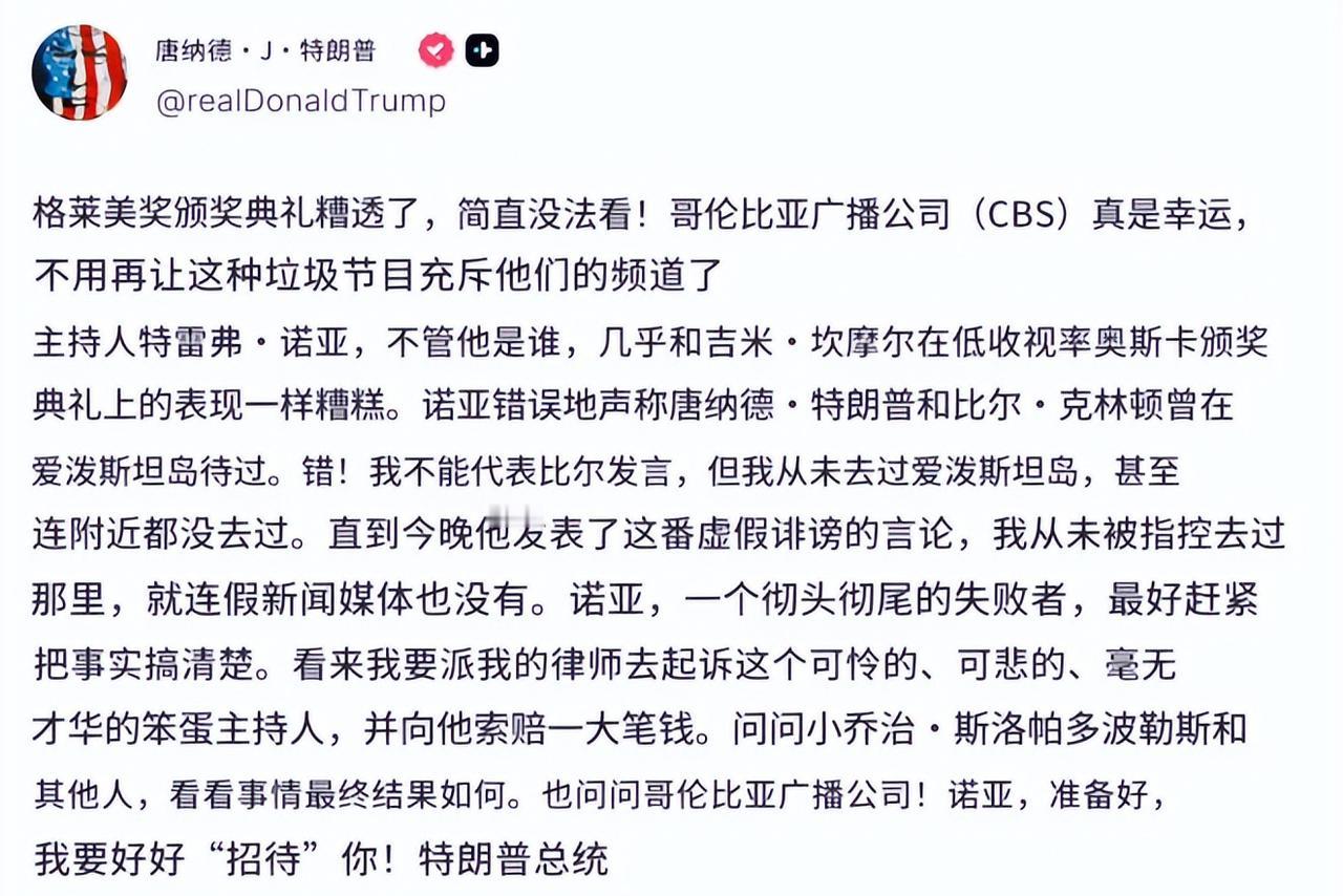 美国知名脱口秀主持人崔娃在格莱美颁奖礼上惹怒特朗普,特朗普扬言要好好“招待”他,索赔一大笔钱。 崔娃大家应该很熟悉很多人喜欢他的脱口秀节目,在刚刚的格莱美颁奖礼上作为主持人的他火力全开讽刺特朗普。因前两天美国知名说唱女歌手麻辣鸡为特朗普的活动站台,崔娃当众调侃麻辣鸡今天没来是因为在白宫和特朗普讨论特别重要的事情。这还没完,他还调侃特朗普去过那个神秘小岛。 这下完了惹恼了特朗普,他发文先是否认自己去过神秘小岛,然后嘲讽了一番崔娃主持的节目,最后使出老手段起诉!誓要让崔娃付出代价。特朗普也是够忙的哪都要插一脚,前有摩根大通、后有美联储鲍威尔,现在又是崔娃,得罪自己的人一个也不放过全部起诉。[捂脸]