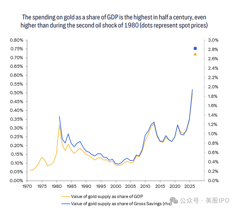 首先是与实体经济的脱钩:目前全球对黄金的年度支出占GDP比例已飙升至0.7%,这是过去55年来的最高水平,远超1980年石油危机时期。