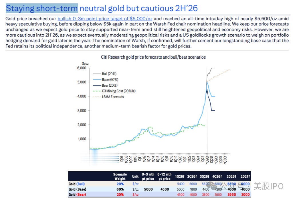 尽管短期内(0-3个月)花旗维持对金价的支撑看法,目标价看至5400-5600美元/盎司,理由是地缘政治和经济风险依然高企。但对于2026年下半年,花旗的态度转为明显的“谨慎”。
