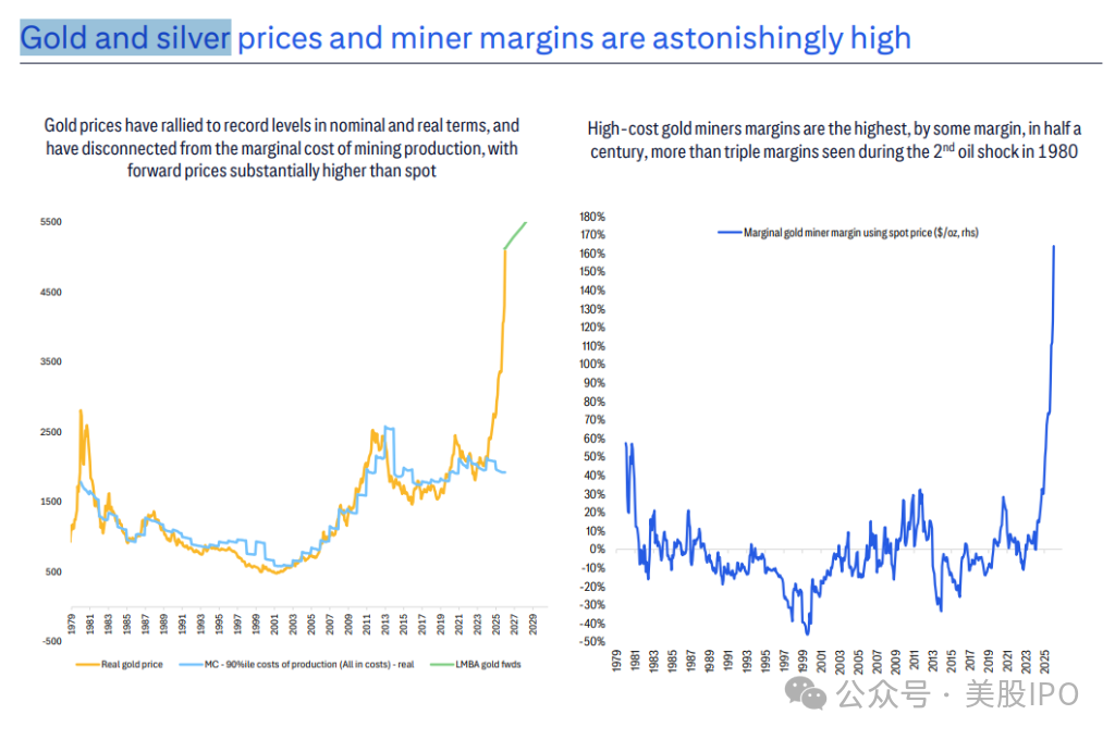 同时,当前的金价已完全脱离了采矿业的边际生产成本。研报显示,高成本金矿商的利润率正处于50年来的最高水平。