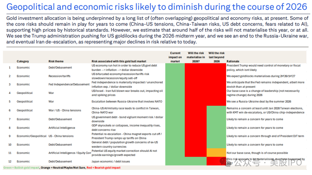 花旗预计,支撑当前高金价的一系列风险因素将在今年晚些时候消退。具体而言: