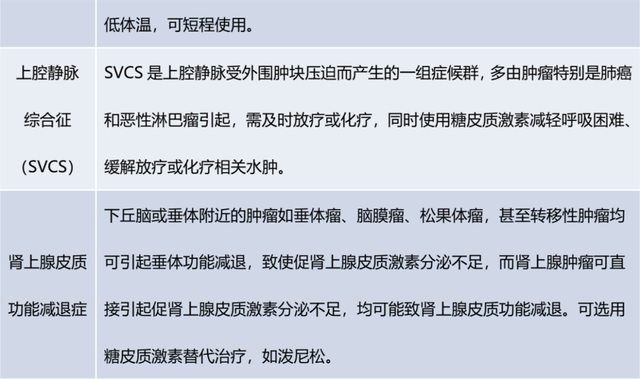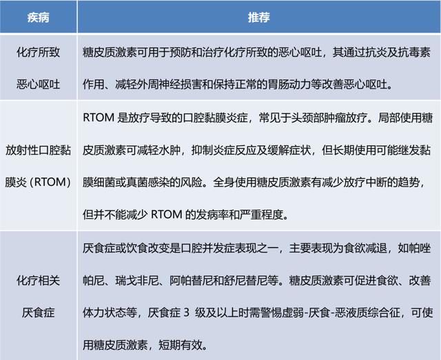 糖皮质激素可与化疗药物协同直接抗肿瘤,糖皮质激素有溶解淋巴细胞的作用,可将其作为联合化疗方案的组分之一,用于淋巴系统恶性肿瘤如急性淋巴细胞白血病、淋巴瘤、多发性骨髓瘤等的治疗。糖皮质激素在肿瘤并发症中,可用于治疗癌痛、瘙痒、厌食、恶病质、肿瘤周围水肿(PTBE)、脊髓压迫症、癌因性乏力(CRF)、高钙血症、癌性发热、上腔静脉综合征(SVCS)、肾上腺皮质功能减退症等。肿瘤治疗过程中,糖皮质激素可治疗放化疗相关不良反应如恶心呕吐、口腔黏膜炎、厌食症、骨髓抑制、肺损伤、肠损伤、脑病、输液反应、皮肤反应、皮炎等。糖皮质激素在肿瘤并发症中的使用