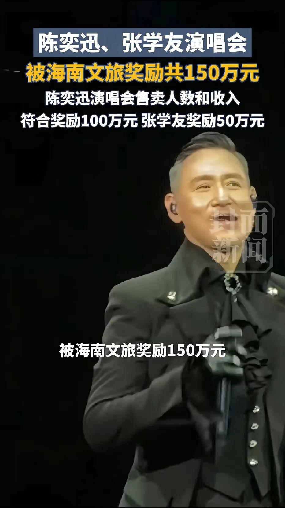 真的是越有钱就“越有钱”,羡慕了!陈奕迅和张学友的演唱会,被海南文旅奖励共计150万。其中陈奕迅的演唱会售卖人数和收入符合奖励100万元!(羡慕的话真的说的太多了),张学友是奖励50万元。 我看到有一个网友开玩笑说,他们还缺这个钱吗?[捂脸]不过话说回来,两个人的演唱会真的很精彩,人家应该得的。陈奕迅演唱会