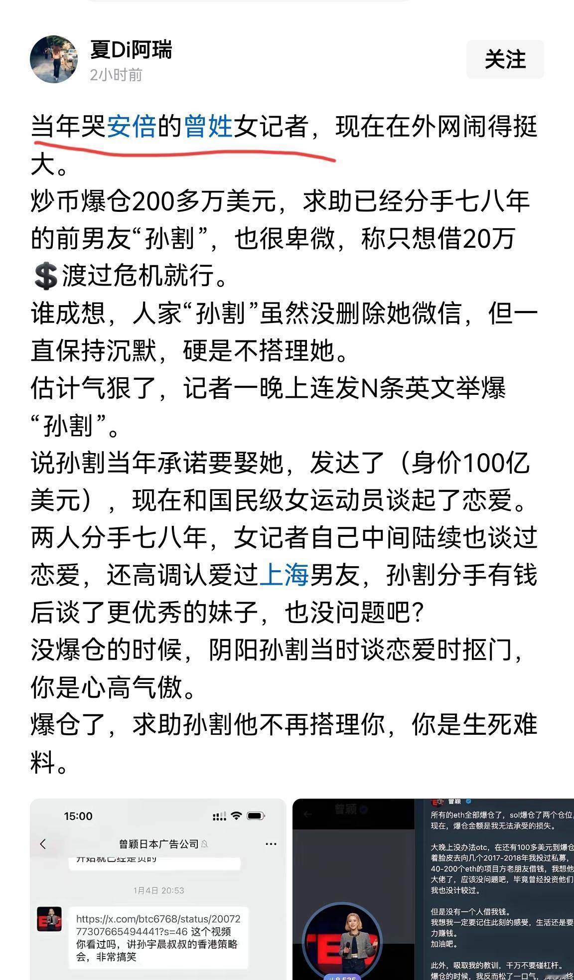 博主爆料曾经给鬼子留下眼泪的女记者,在这次虚拟币爆仓中赔进去了十几年的积攒。