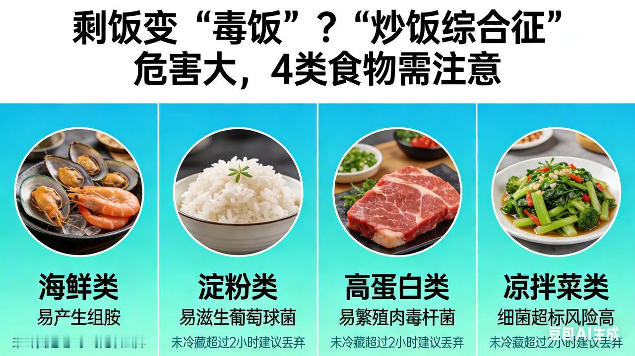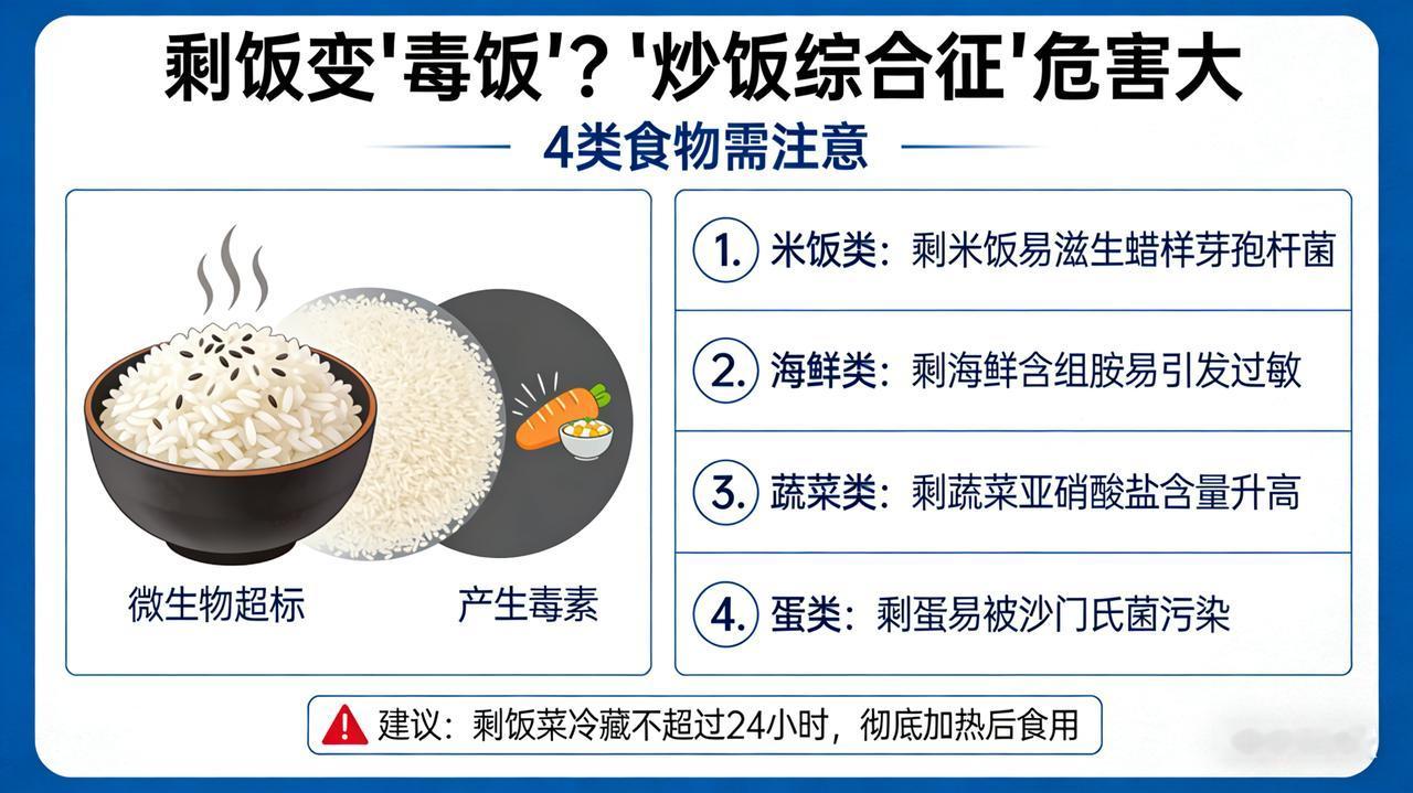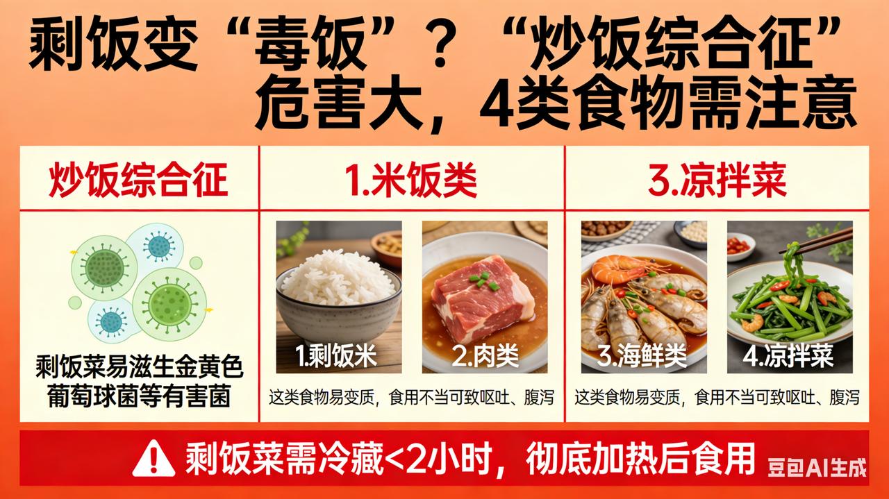 剩饭变 “毒饭”?“炒饭综合征” 危害大,4 类食物需注意 一碗炒饭“藏毒”:男子濒死,多脏器集体“罢工” 在医院的急诊室里,时间仿佛被按下了加速键,每一秒都关乎生死,一场与死神的激烈角逐正紧张上演。而这场惊心动魄救援的“导火索”,竟是一碗被很多人视为寻常的隔夜炒饭。 这位男子一直秉持着节俭的生活理念,觉得隔夜食物倒掉实在可惜。那天,他打开冰箱,看到前一天剩下的炒饭,色泽虽不再如刚出锅时鲜亮,但他没多想,简单加热后便大快朵颐起来。可他怎么也想不到,这一口口咽下的,不是美味,而是能将他拖入深渊的“毒药”。 饭后不久,男子便感觉腹部像是被一台疯狂运转的搅拌机肆意搅动,剧痛如汹涌的潮水般瞬间将他淹没。他脸色煞白,豆大的汗珠不停地从额头滚落,身体不受控制地颤抖着。紧接着,恶心感如排山倒海般袭来,他开始疯狂呕吐,仿佛要把整个胃都翻出来。腹泻也接踵而至,整个人虚弱得像一片在狂风中飘零的枯叶,瘫倒在地上,意识逐渐模糊。 家人发现后,惊恐地尖叫起来,手忙脚乱地将他送往医院。此时,男子的情况已经危急到了极点,血压直线下降,如同断了线的风筝,呼吸也变得微弱而急促,仿佛下一秒就会停止。医生迅速展开全面检查,最终诊断他患上了“炒饭综合征”——一种由蜡样芽孢杆菌引发的严重食物中毒。这种细菌在隔夜米饭中疯狂滋生繁殖,产生的毒素就像一把把锋利的匕首,无情地刺向他的消化系统、神经系统。 很快,男子的身体全面崩溃,多脏器衰竭的噩梦降临。肾脏、肝脏等重要器官仿佛被点燃的火药桶,功能急剧下降,生命之火在狂风中摇摇欲坠。医院立刻组织多学科专家会诊,制定抢救方案。医护人员们争分夺秒,与死神展开了一场惊心动魄的拔河比赛。 经过连续多日紧张到令人窒息的治疗,男子终于从鬼门关前被拉了回来,逐渐恢复了健康。但这次死里逃生的经历,让他和家人刻骨铭心,也为我们所有人敲响了食品安全的警钟:隔夜食物,或许就是隐藏在身边的“健康炸弹”!