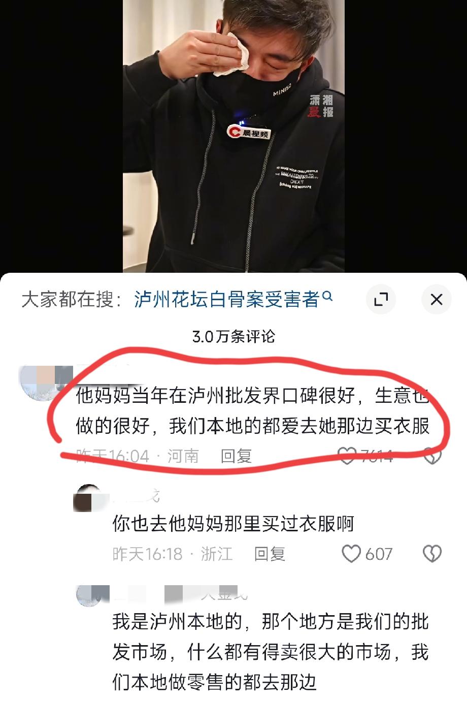受害者儿子使劲摆手摇头,忍着不哭出大声说:“我真的不敢去想!我能接受妈妈死了,可是我真的不能接受妈妈是这样子死的,那么大个人,就挤缩在这么小的花坛里面,这一待就是28年……” 儿子之所以这么痛苦,是因为他妈妈真的很爱他,小时候妈妈是单亲,努力做服装生意,以前老客户都说他妈妈口碑特别好,都喜欢从她家进衣服,说明生意做得风生水起。所以妈妈都已经提前给儿子规划好了人生 : 给儿子过享福的生活,长大后出国留学、买房子等等…妈妈要是一直在,他儿子就是妥妥的富二代了 谁知道,自从妈妈失踪之后,儿子初中都没念完就辍学了,因为凶手的贪婪,毁了一位可能在生意界出来的好老板,更是毁了一位孩子本来很美好的人生! 泸州白骨案