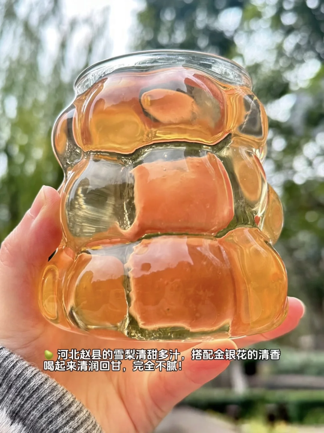 🌈配料表超干净,就是水、雪梨干和金银花,真正煮出来的中式养生水,和家里炖的一个味儿~ 河北赵县的雪梨清甜多汁,搭配金银花的清香,喝起来清润回甘,完全不腻!
