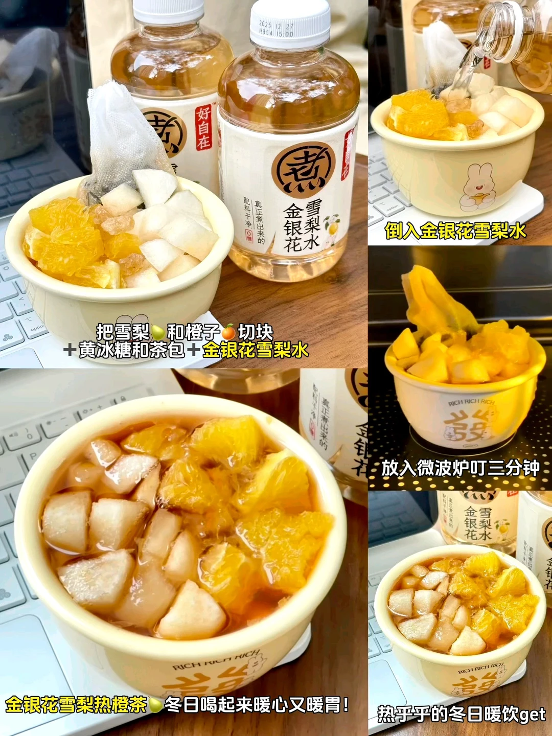 🌈还可以在家自制懒人金银花雪梨热橙茶!雪梨🍐橙子🍊切块,加入黄冰糖,加入红茶包,再倒入好自在金银花雪梨水,放在微波炉里面叮三分钟就好了!比加清水味道更浓郁,热呼呼的雪梨橙茶,和家人新年每人来上一碗,喝起来暖心又暖胃!!