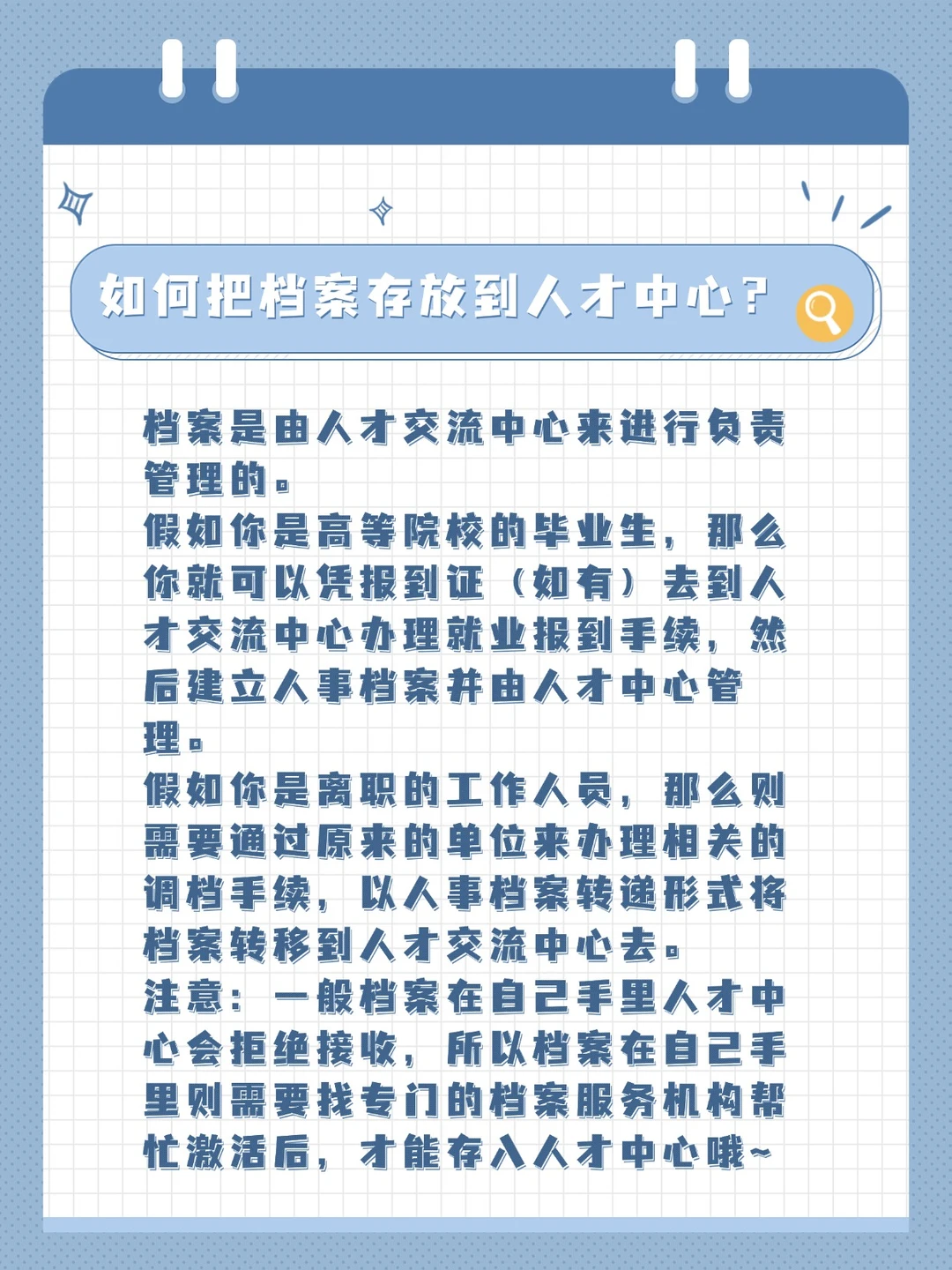[举手R]注意:一般档案在自己手里人才中心会拒绝接收,所以档案在自己手里则需要找专门的档案服务机构帮忙激活后,才能存入人才中心哦~