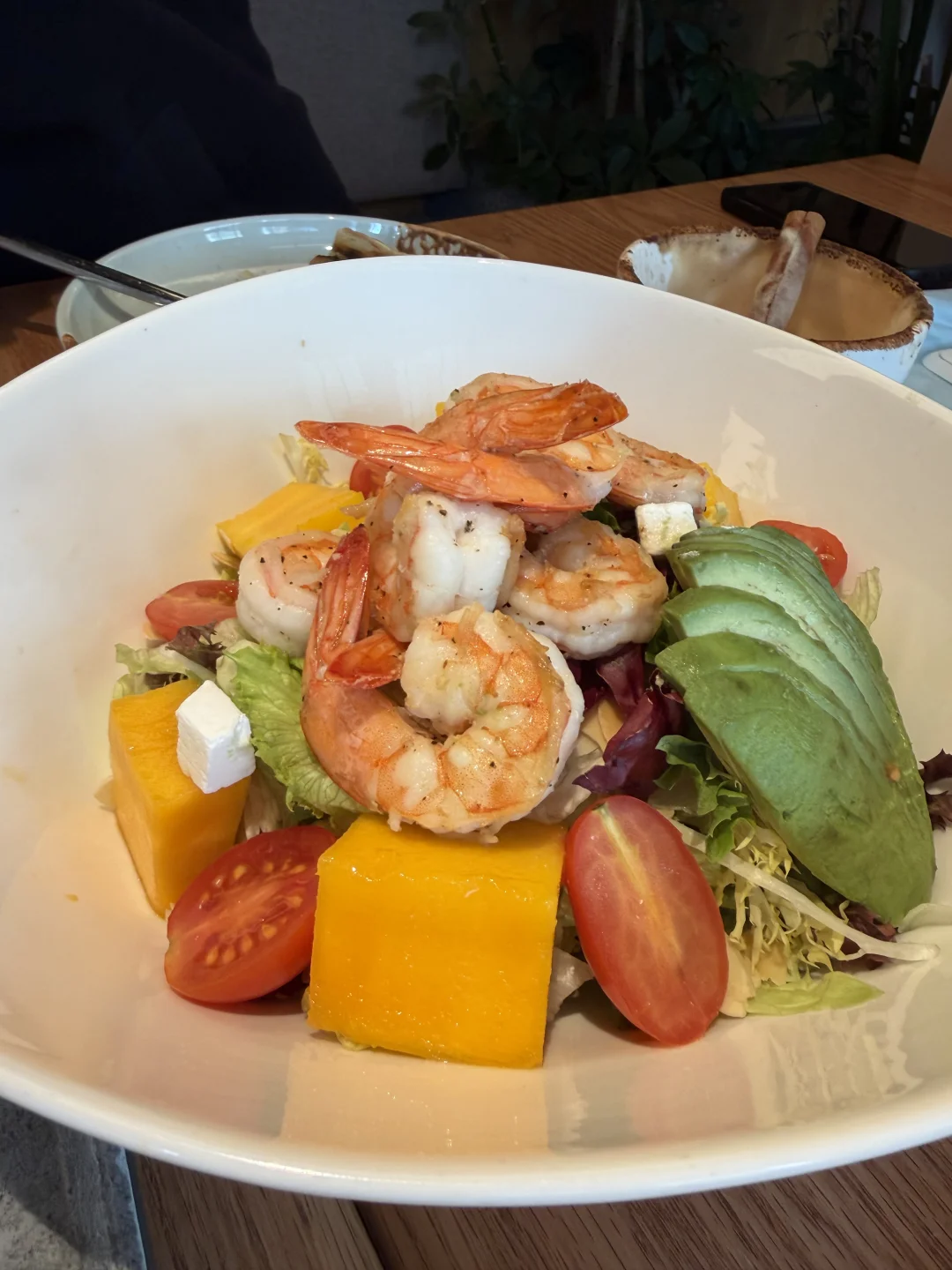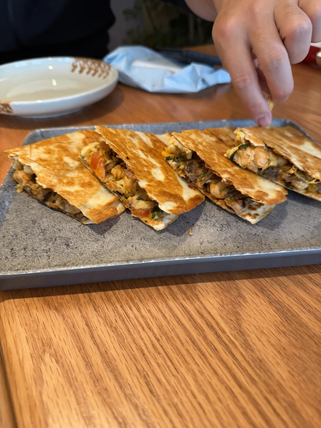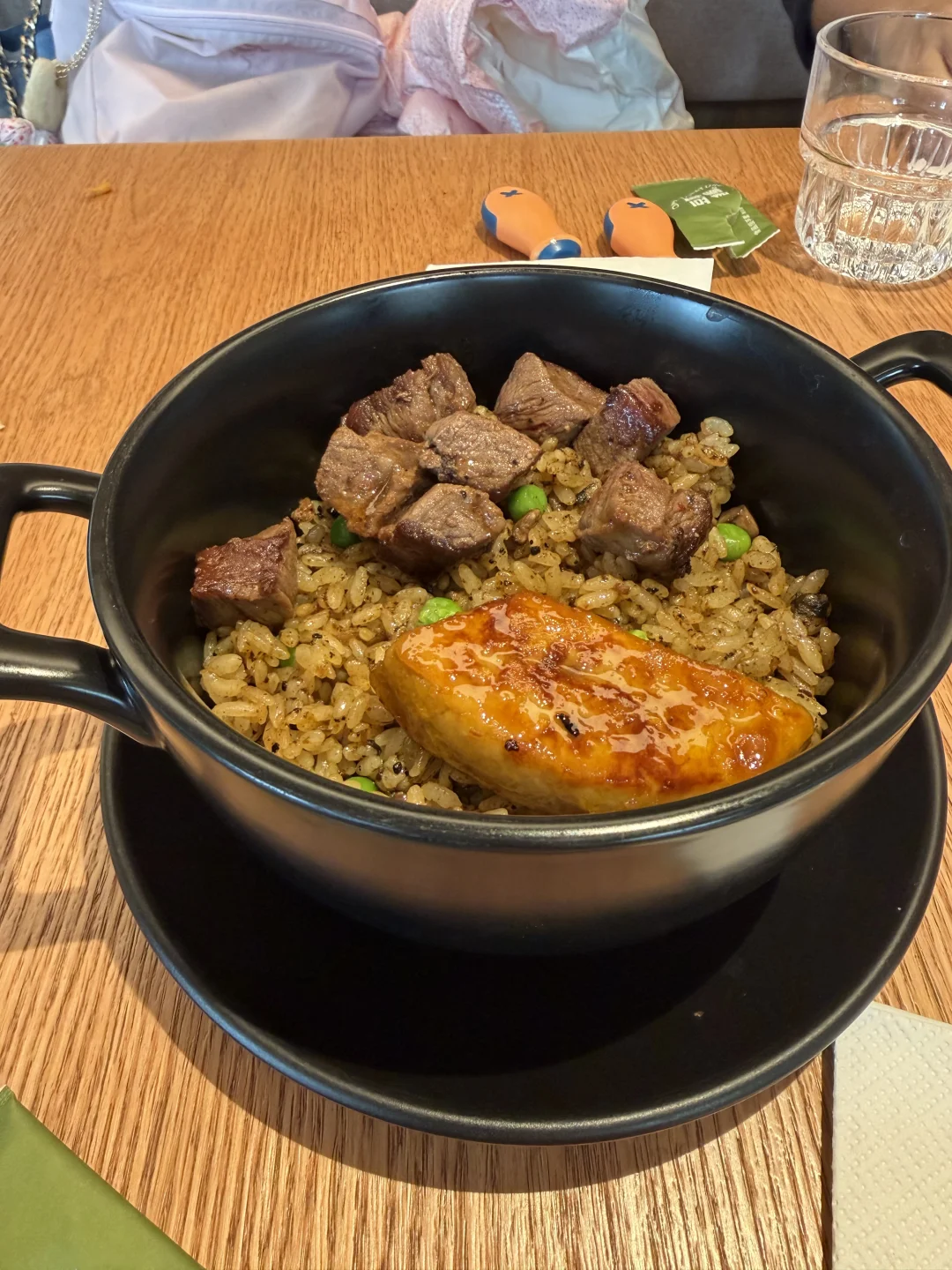 之前每次来CP静安都看到这家豆库大排长龙~今天起得早立马来尝试,中桌拿了三号,稍微排了一会会儿~ 就非常干净的西餐~点了招牌的黑松露鹅肝牛肉炒饭,芒果大虾色拉,招牌辣味鲜虾馅饼~都很好吃~色拉里的蔬菜和水果都很新鲜~薄饼很脆~鹅肝煎的很嫩~听到旁边三个小姐姐也赞不绝口~想下周继续来品尝其他的餐品了~ 甜品点了招牌的巧克力榛子脆~又打包了新品的草莓塔“宠爱”,太太太美貌了~吃不够还打包了国王饼、欧包~ 饮品点了肉桂果香拿铁和奶油雪山,都很好喝~ 真的各品类都无雷!!!小朋友每道都很喜欢!!!