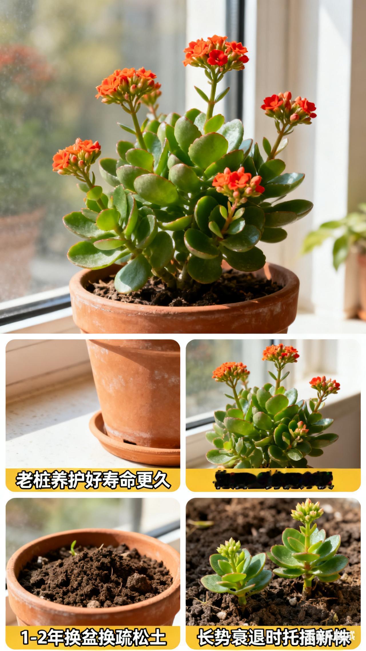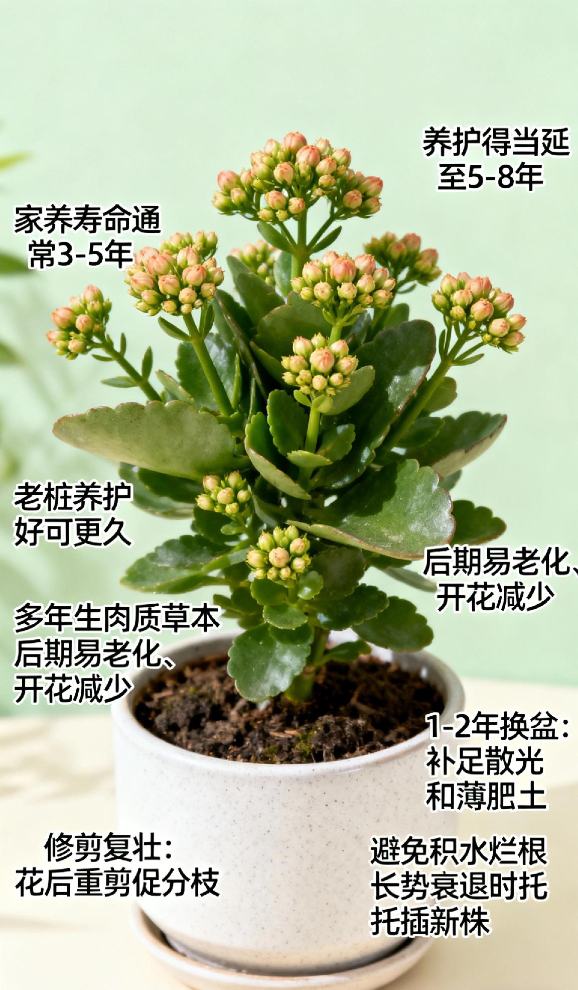 长寿花的寿命有多长长寿花盆栽家养寿命通常3-5年,养护得当能延至5-8年,老桩养护好可更久。它是多年生肉质草本,后期易老化、开花减少,需靠修剪复壮,花后重剪促分枝,1-2年换盆换疏松土,补足散光和薄肥,避免积水烂根,长势衰退时扦插新株,可延续观赏期。, 长寿花 家养长寿花 长寿花养护 长寿花盆栽 阳台养长寿花 多肉长寿花