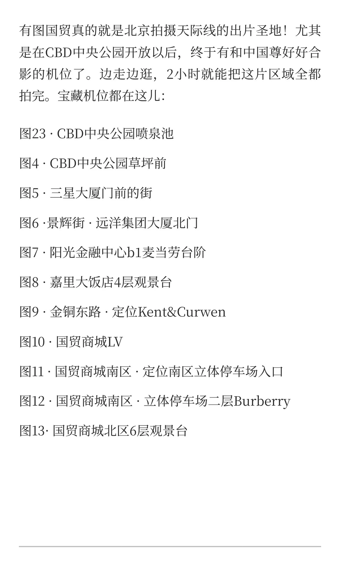 国贸真的就是北京拍摄天际线的出片圣地!尤其是在CBD中央公园开放以后,终于有和中国尊好好合影的机位了。边走边逛,2小时就能把这片区域全都拍完。宝藏机位都在这儿: