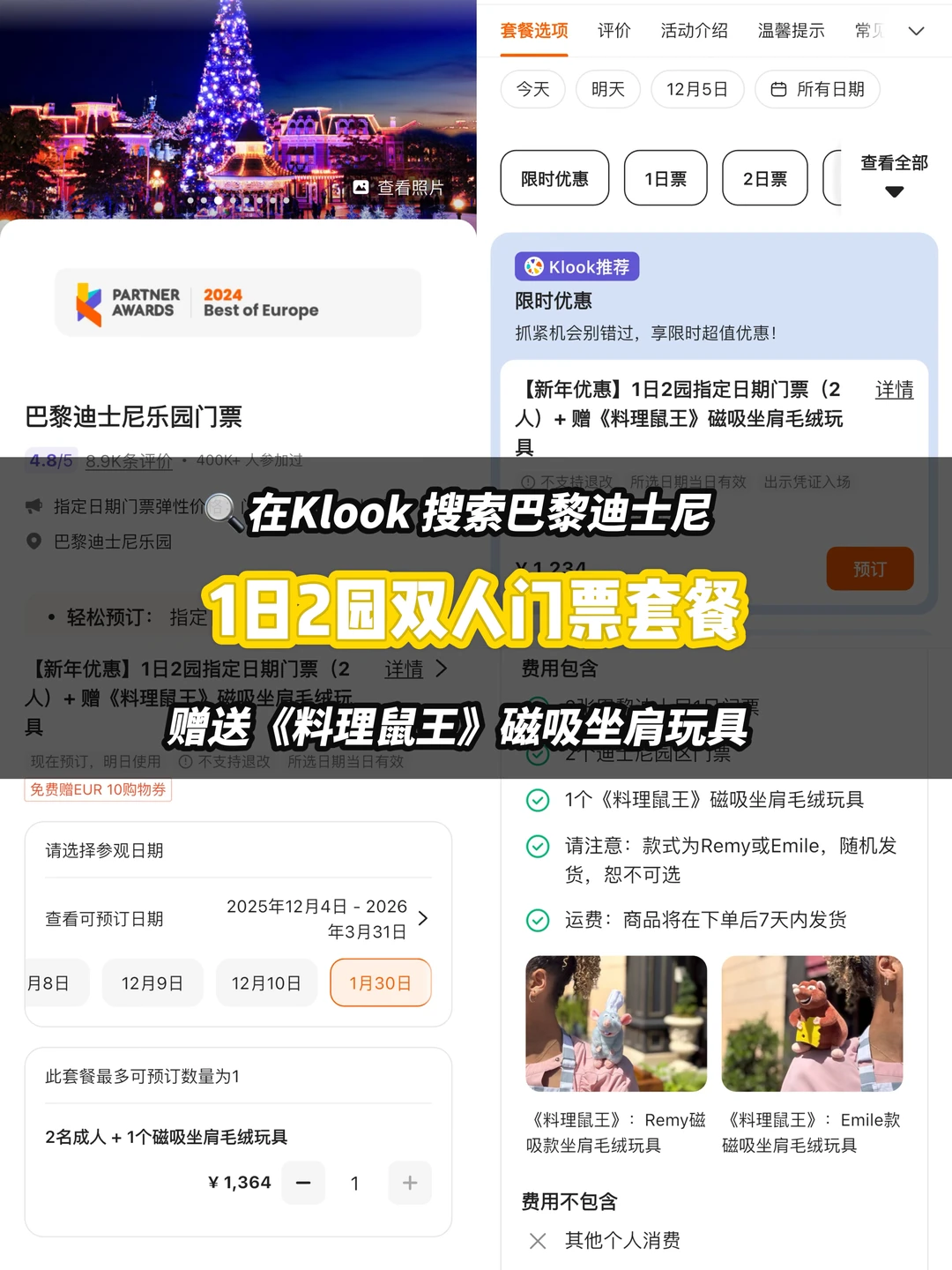 对比各平台,我最后是在Klook上买的。一个是它主做境外游,门票靠谱选择的套餐比较多,中文预订rmb支付很方便,欧洲的各种。第二个是领完券后,价格确实是几家里划算的,现在下单「1日2园双人门票套餐」,《料理鼠王》磁吸坐肩玩具直接赠送!都省的买...