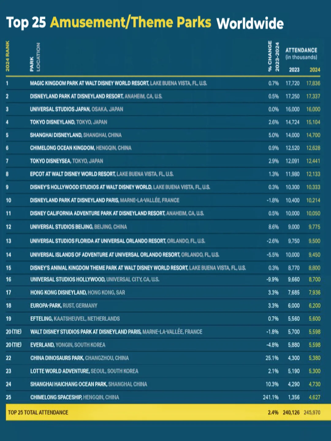 全新一期的全球乐园年度访问排行榜终于揭晓了!榜单给我一种迪士尼吊打全球的感觉…Top10里面8个乐园都是迪士尼系的。国内有两座乐园上榜,一座纯国产品牌~
