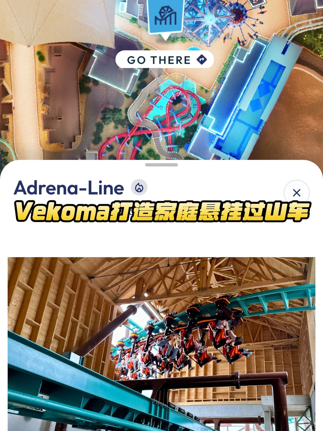 3️⃣ 肾上腺素(Adrena-Line):Vekoma打造的家庭悬挂过山车,主导一个家庭友好。这台车子全球已经有30+台了,轨道会穿越站台上方的设计很独特。国内方特最爱买,也有几台的配置了,并不罕见。