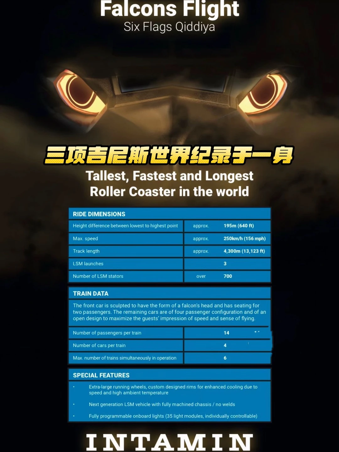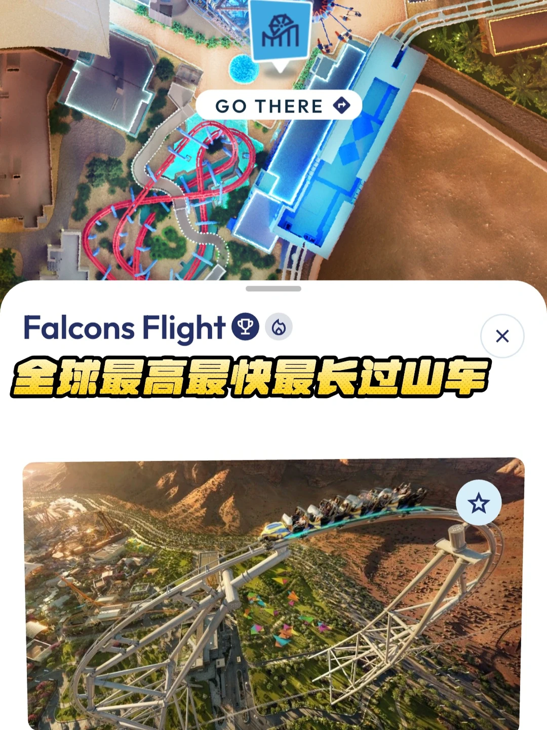 1️⃣ 猎鹰飞翔(Falcons Flight):王牌中的王牌。195米高、250kph、4.3公里长。三项吉尼斯世界纪录于一身的尖叫机器。