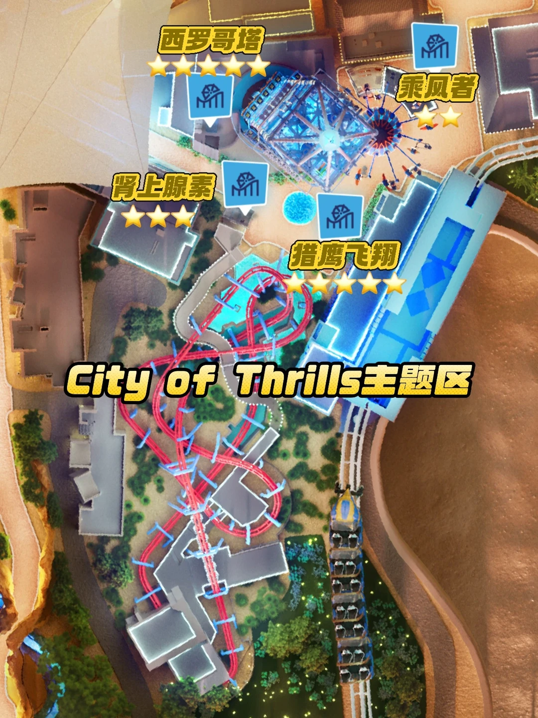 这座主题区就在进门右手边(图1),建议入园直接冲!主打速度与科幻的主题区,有着世界最高最快最长过山车猎鹰飞翔。相信很多玩家也是冲着它来的。绝对是开门的派对王!我把推荐指数在图2中标了星,可以参考收藏!