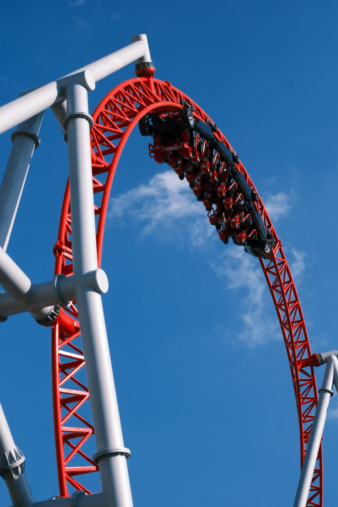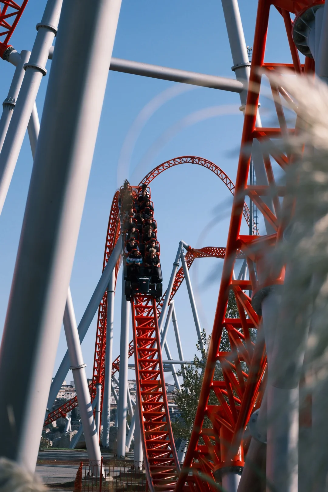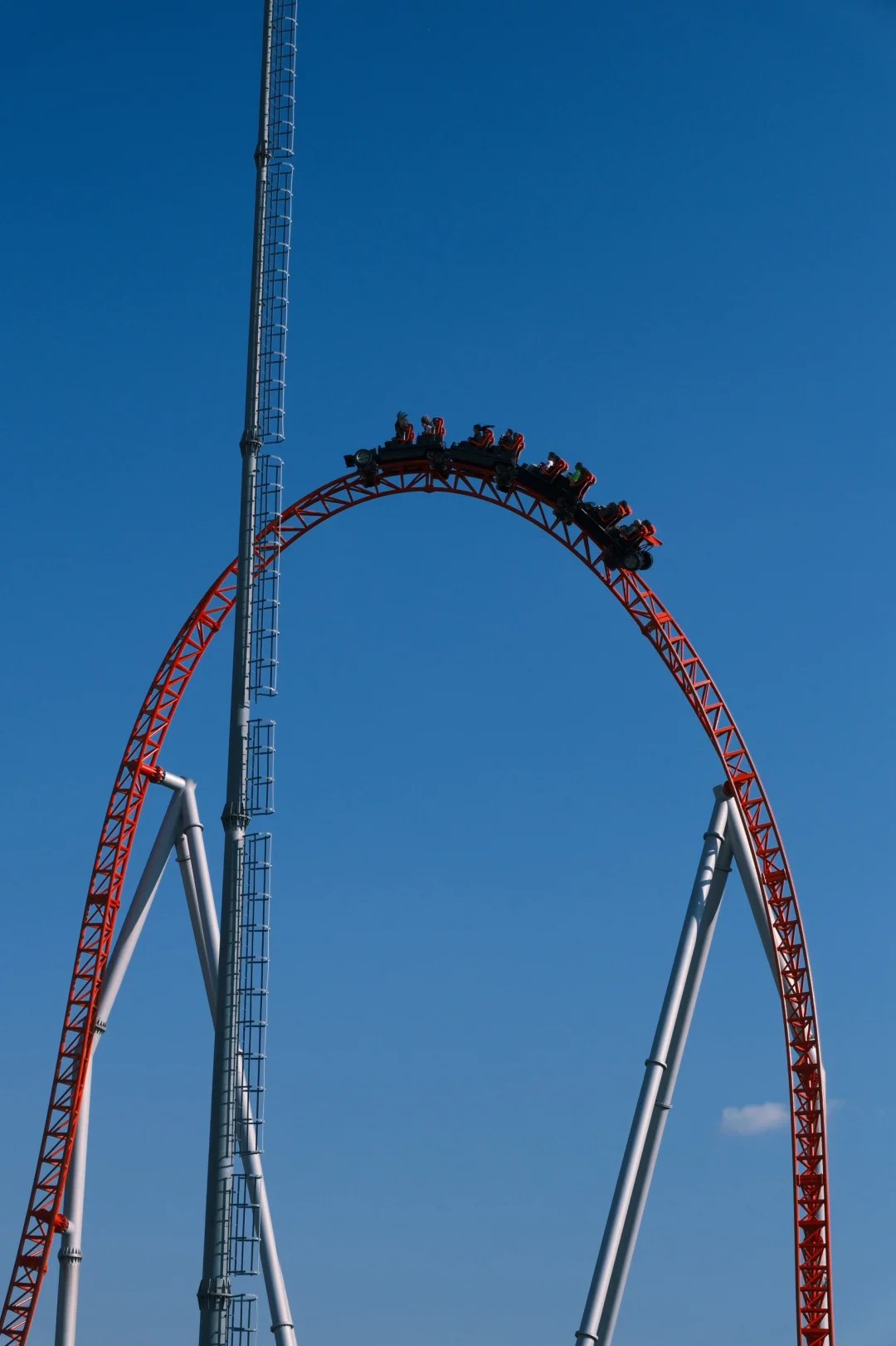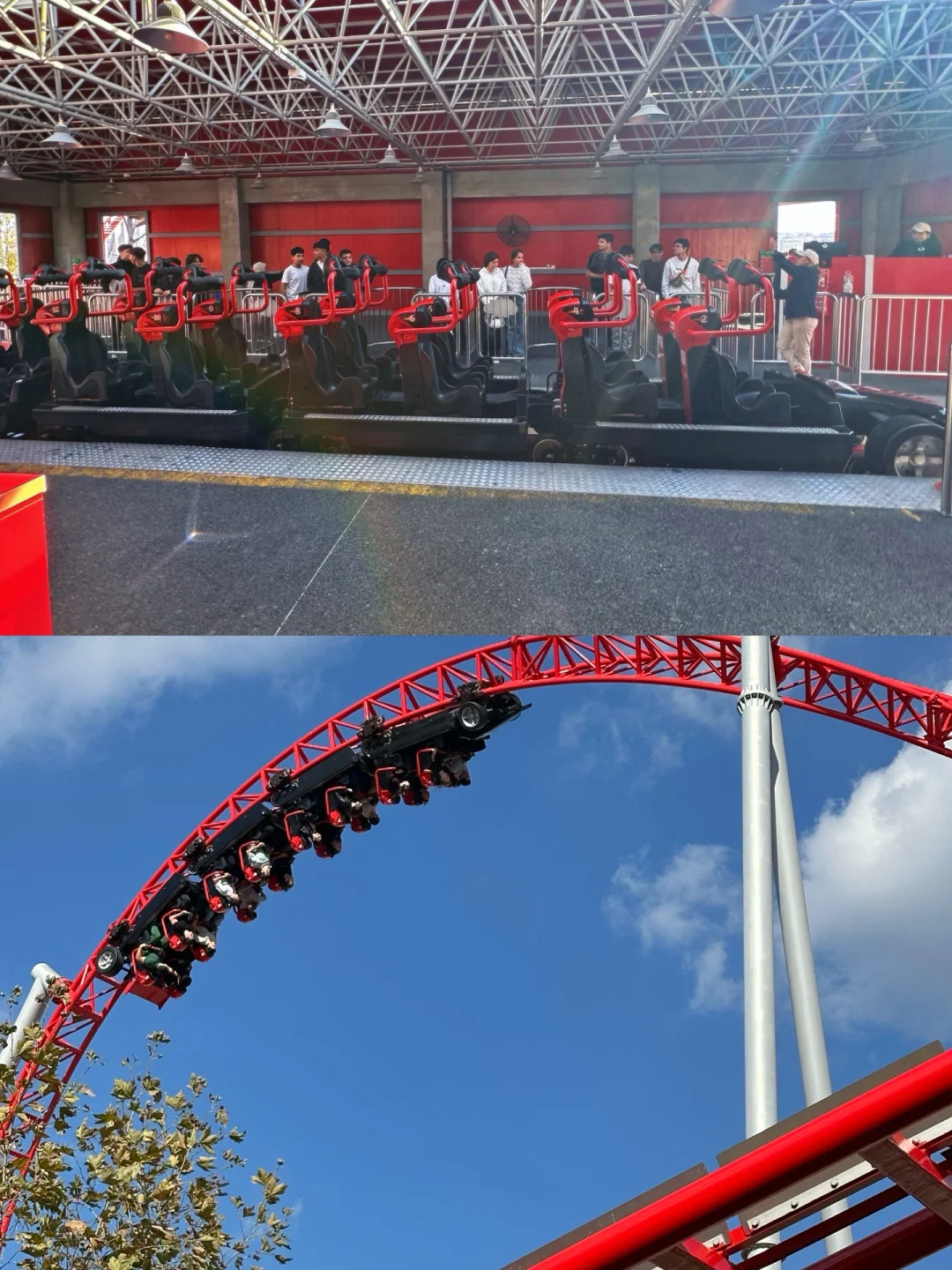 最酷的弹射区,过山车会以110km/h的时速瞬时弹射,冲上50米的高空。轨道设计为外圈礼帽,垂直冲上,180度后垂直俯冲向下。压腿设计格外舒适,途中会有轻盈的airtime,真是一台好车!