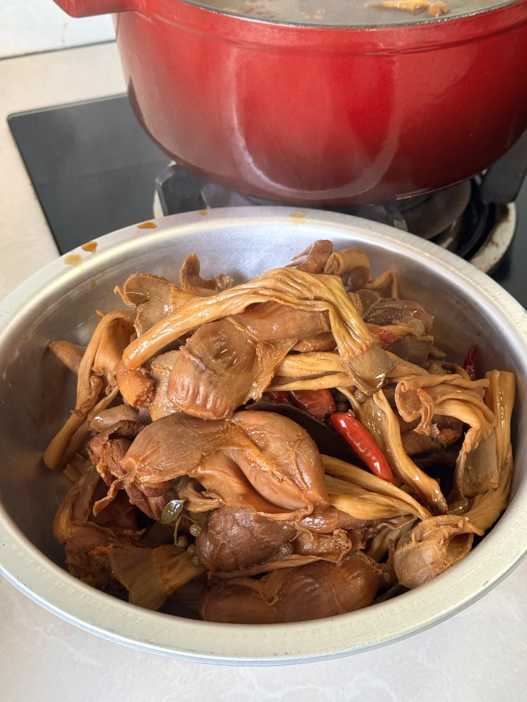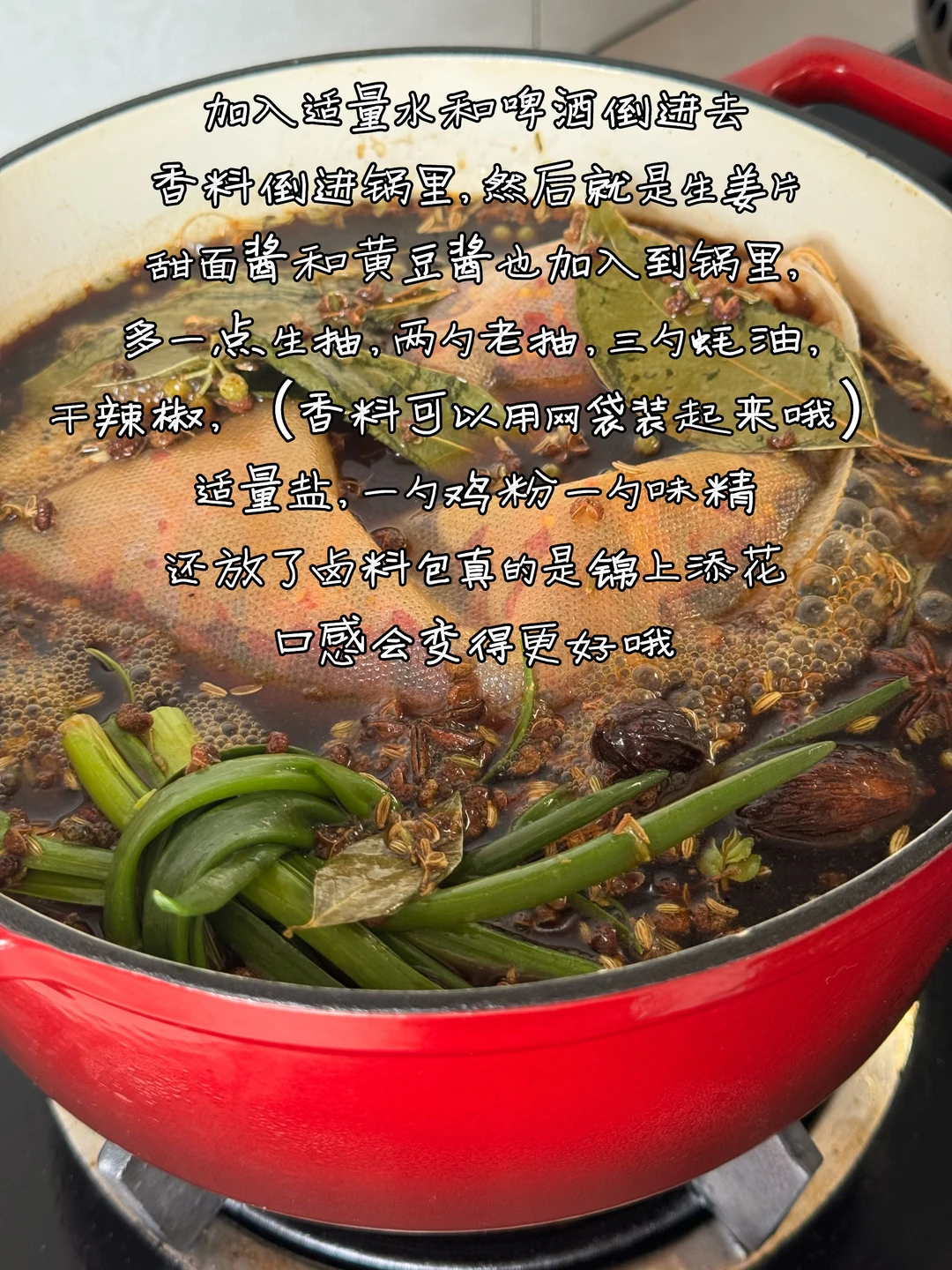 多一点生抽,两勺老抽,三勺蚝油,干辣椒,(香料可以用网袋装起来哦)中火煮半个小时至入味【这个时候尝一下味道缺什么放什么毕竟每家口感不一样】熄火焖几个小时或一个晚上更好