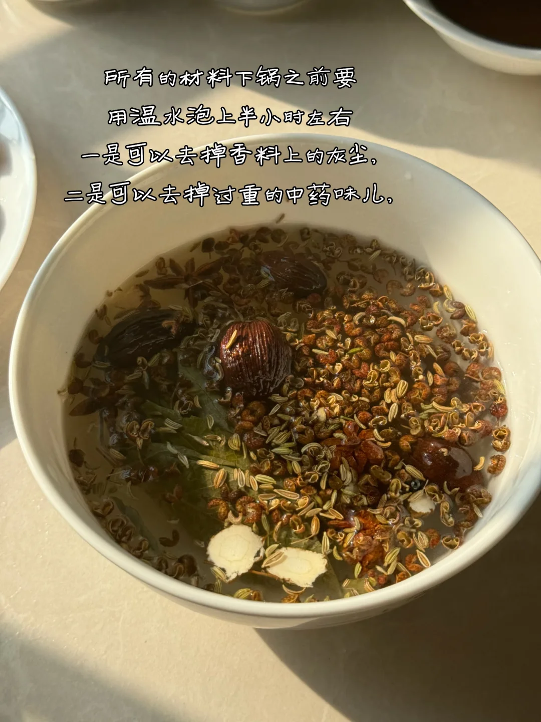 2. 所有的材料下锅之前要用温水泡上半小时左右,一是可以去掉香料上的灰尘,二是可以去掉过重的中药味儿