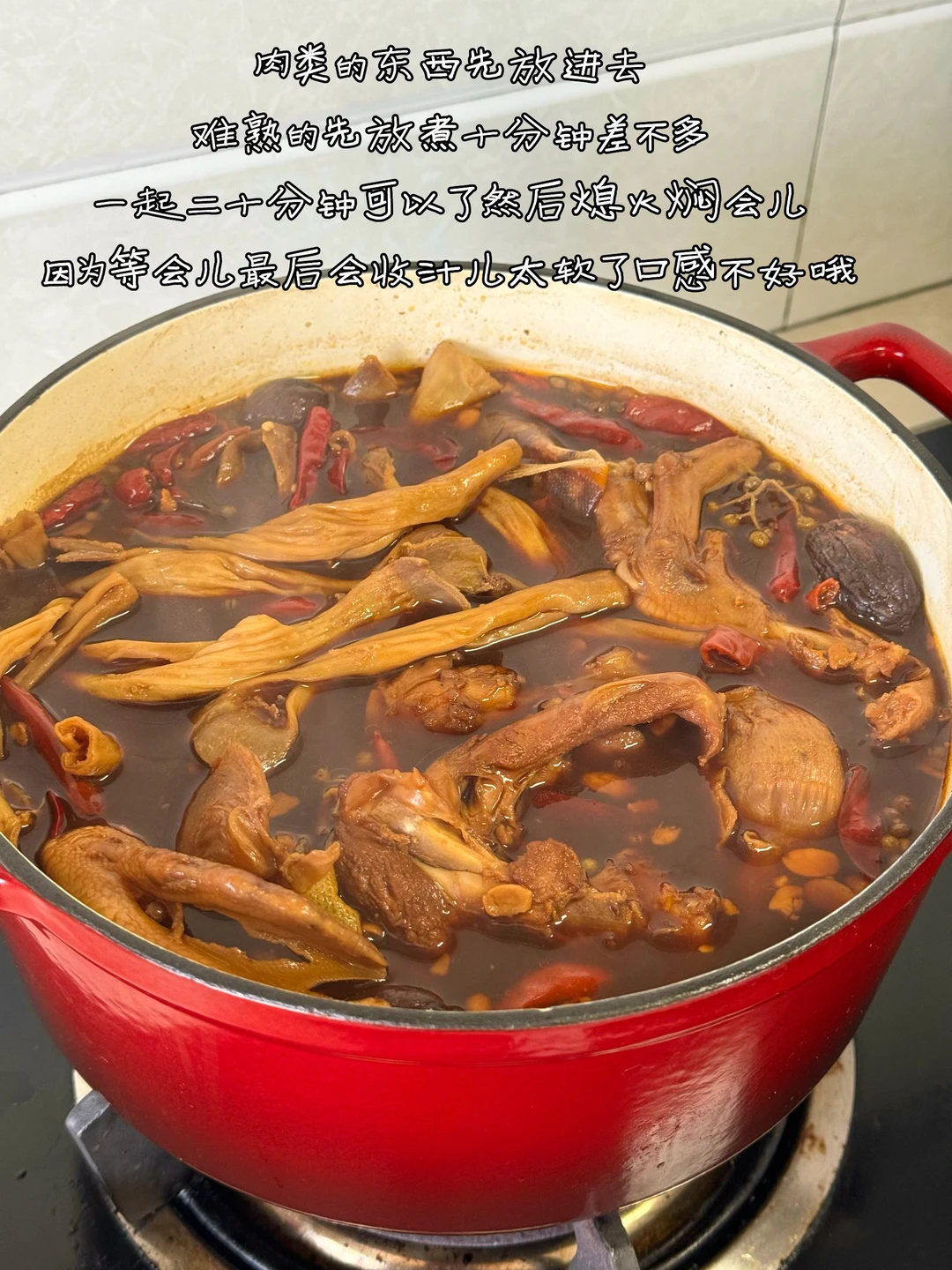 6. 肉类的东西先放进去难熟的先放煮十分钟差不多一起二十分钟可以了然后熄火焖会儿因为等会儿最后会收汁儿太软了口感不好哦