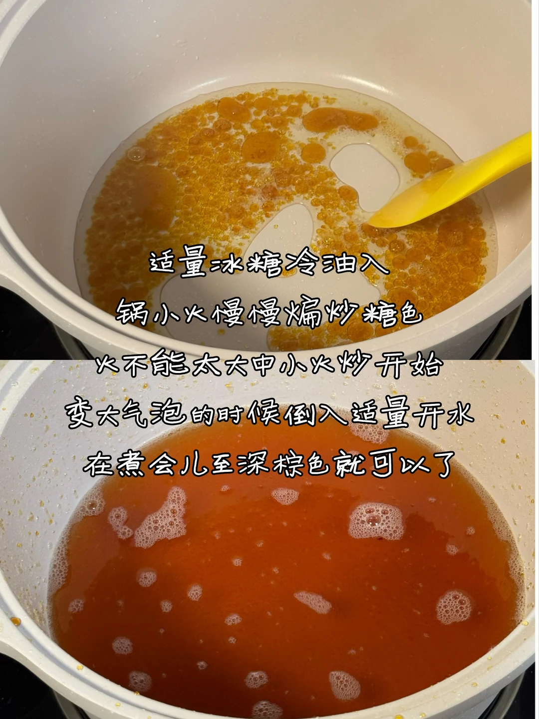 3. 适量冰糖冷油入锅小火慢慢煸炒糖色