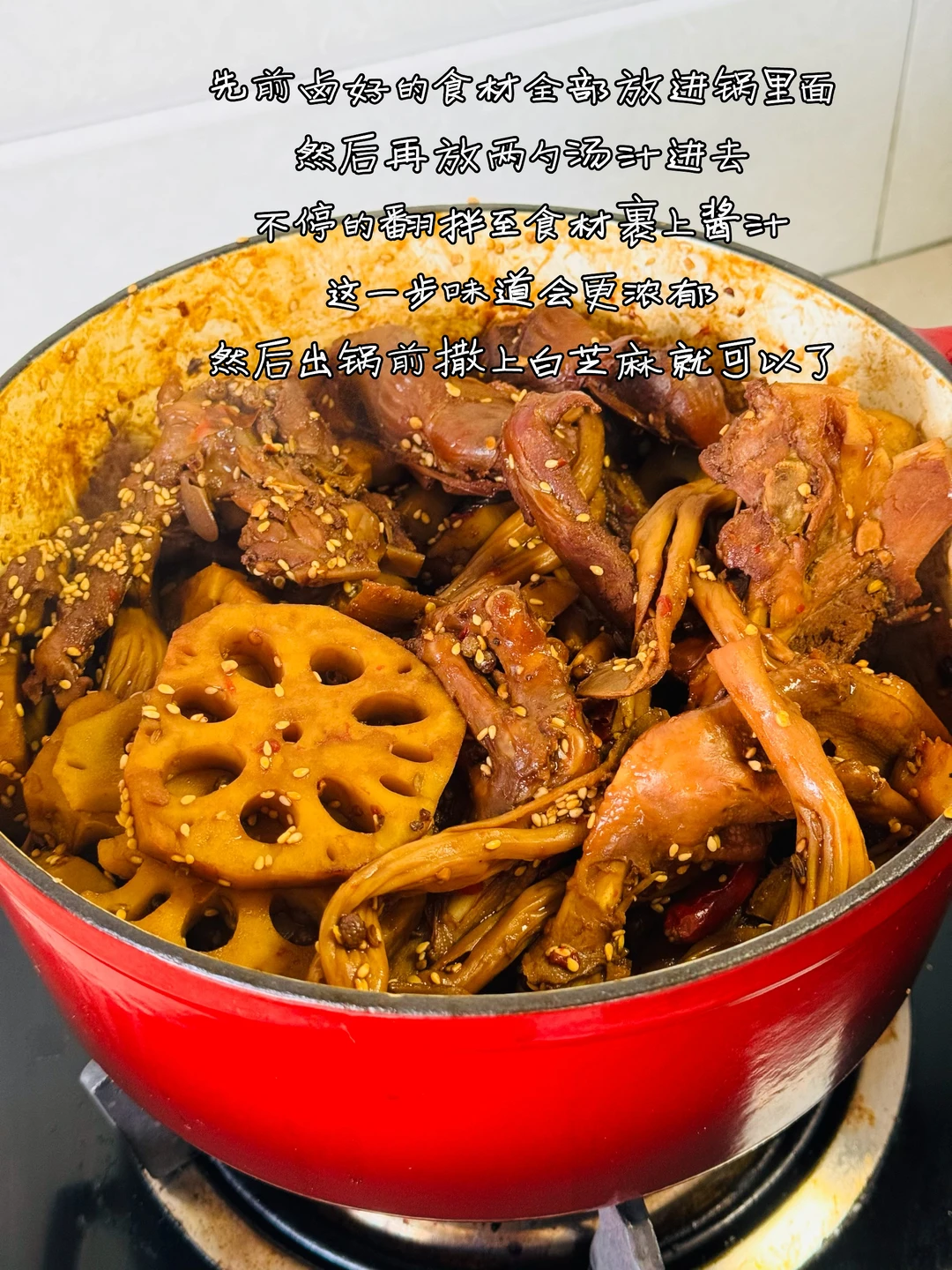 9. 先前卤好的食材全部放进锅里面然后再放两勺汤汁进去不停的翻拌至食材裹上酱汁这一步味道会更浓郁然后出锅前撒上白芝麻就可以了