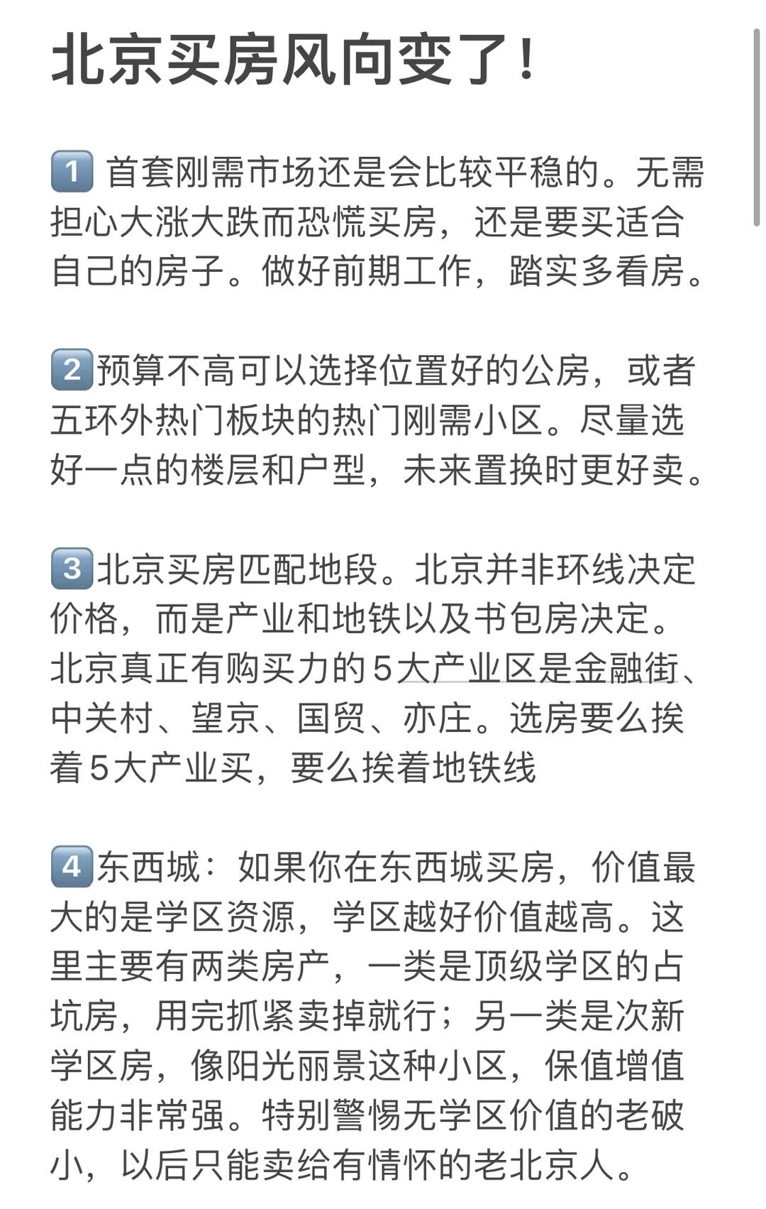 1️⃣ 首套刚需市场还是会比较平稳的。无需担心大涨大跌而恐慌买房,还是要买适合自己的房子。做好前期工作,踏实多看房。