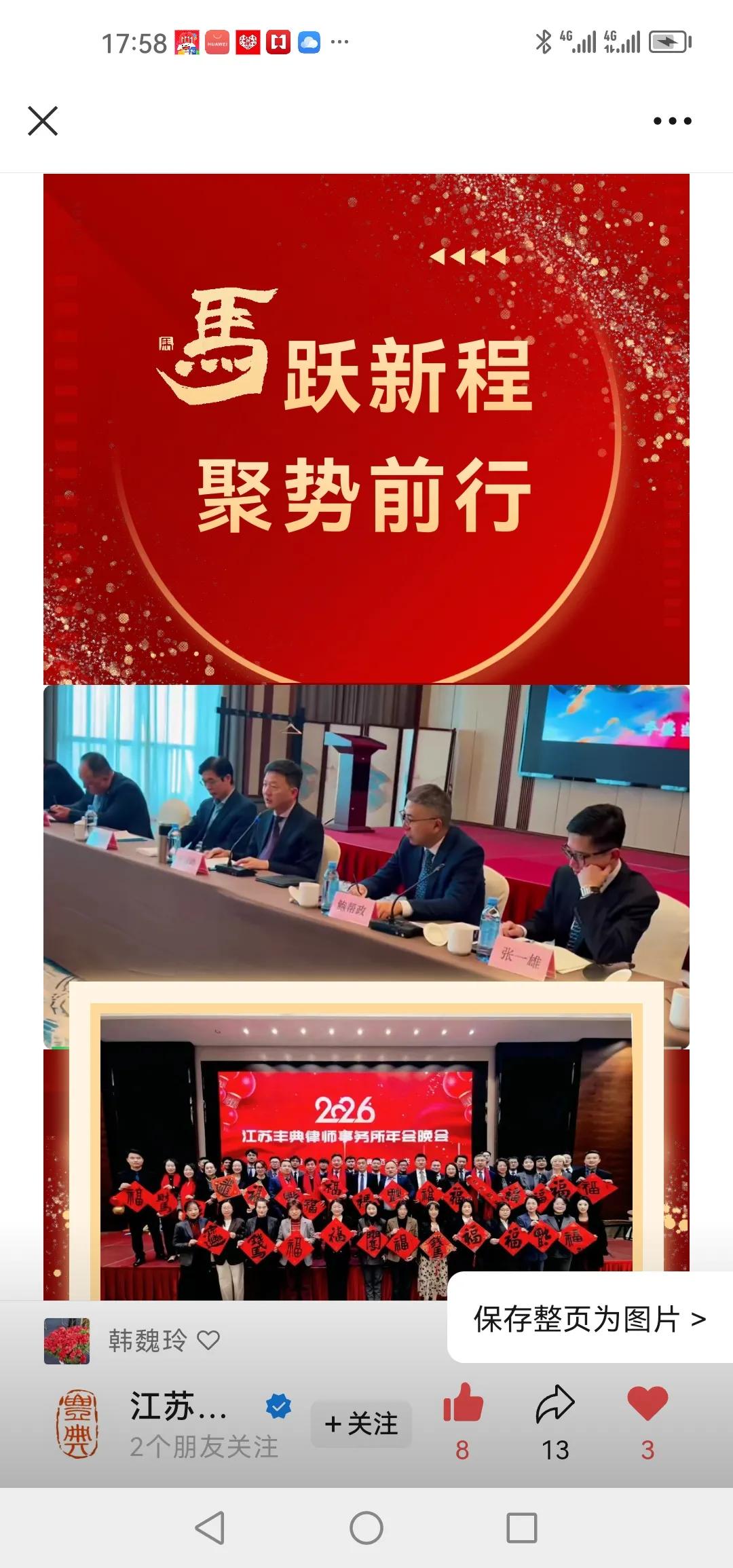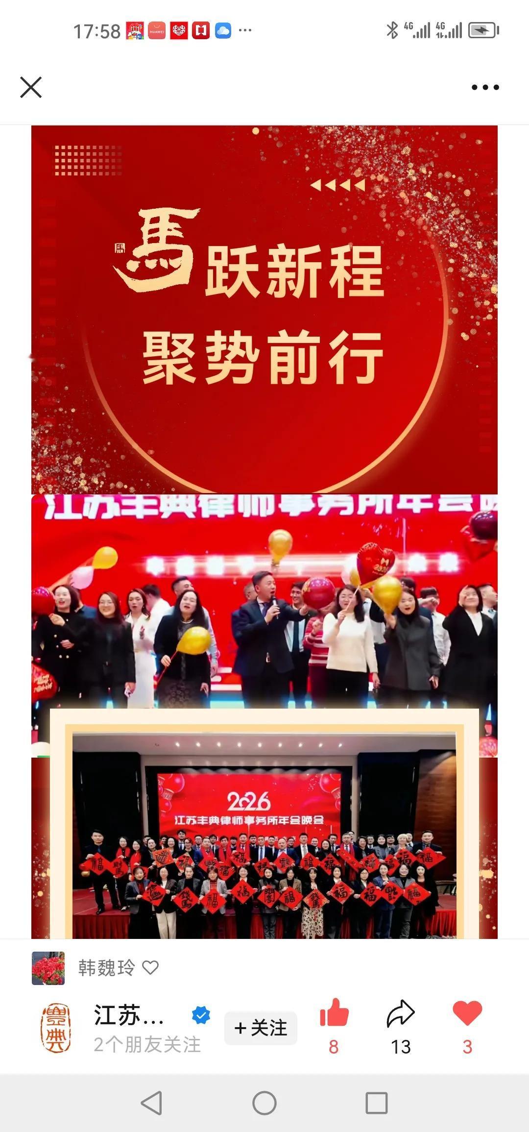 时光荏苒,岁律更新。当乙巳年的余晖渐敛,丙午马年的曙光已悄然临近。2026年1月31日至2月1日,江苏丰典律师事务所举行2026年迎新晚会暨2025年度总结大会。丰典人齐聚一堂,载歌载舞话过往,凝心聚力谋新篇,在欢声笑语中定格年度记忆,在庄重奋进中开启崭新征程。 (韩警伟律师)乙巳年 新甲辰年 乙巳新春 乙巳年 新甲辰年 乙巳新春 乙巳新年 律所庆典活动 法律人过大年 乙巳年高端礼
