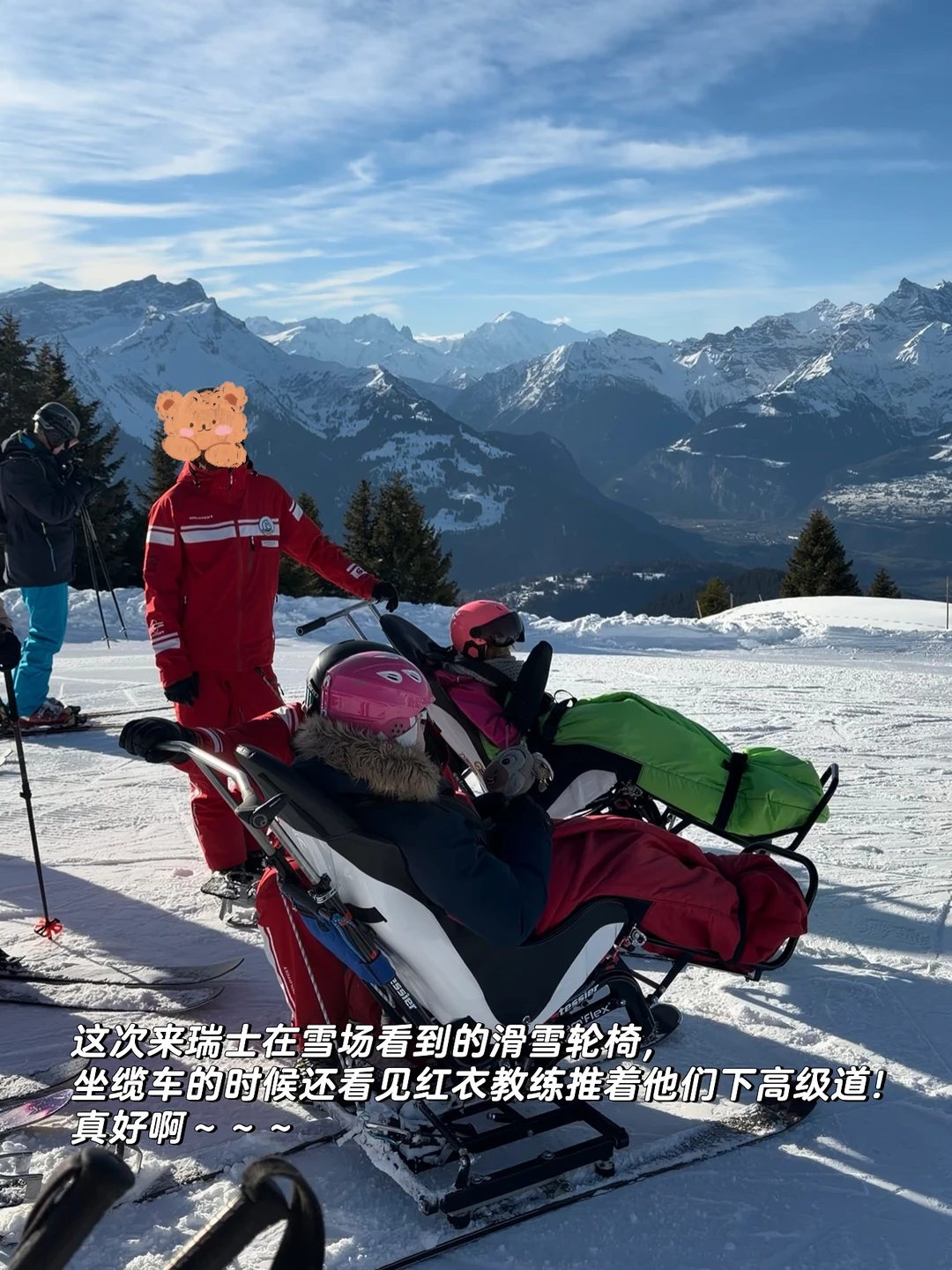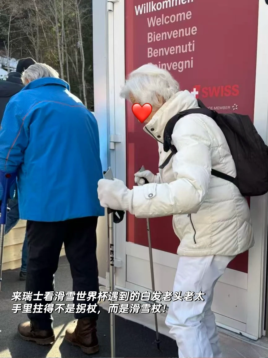 以及这一次来瑞士,滑雪时看到残障人士在辅助下快乐享受雪道;在冬季滑雪世界杯上,遇到一群抱着滑雪板从火车上下来的老年团体,还有看台上为运动员摇旗呐喊的白发大叔。