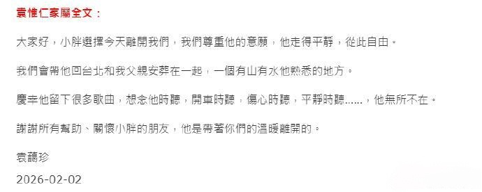 袁惟仁去世袁惟仁讣告 据台媒,著名歌手、音乐制作人袁惟仁去世,享年57岁。家属悼文中写道:“我们会带他回台北,与我父亲合葬在一起,一个有山有水、他熟悉的地方。庆幸他留下了众多歌曲,想念时听,开车时听,伤心时听,平静时听……他无处不在。”亦发文悼念:“R.I.P 小胖。”