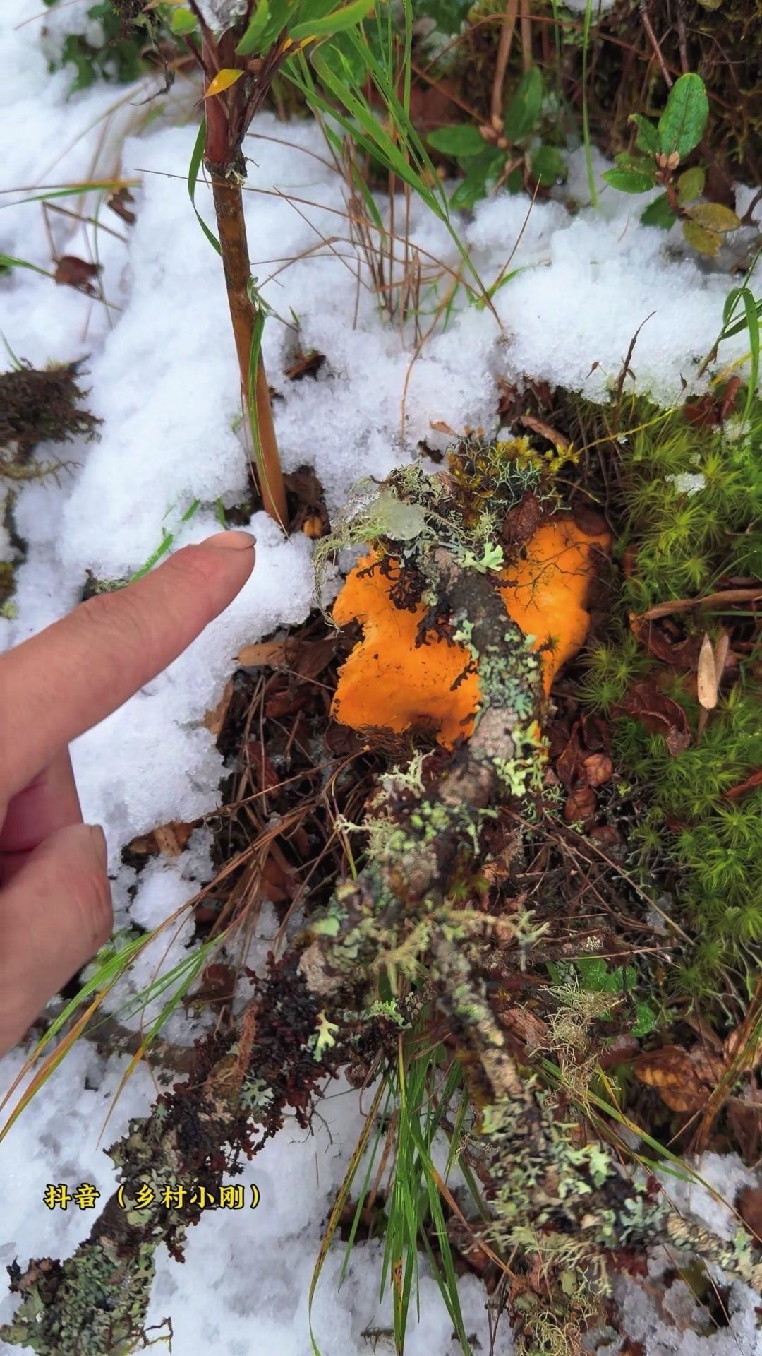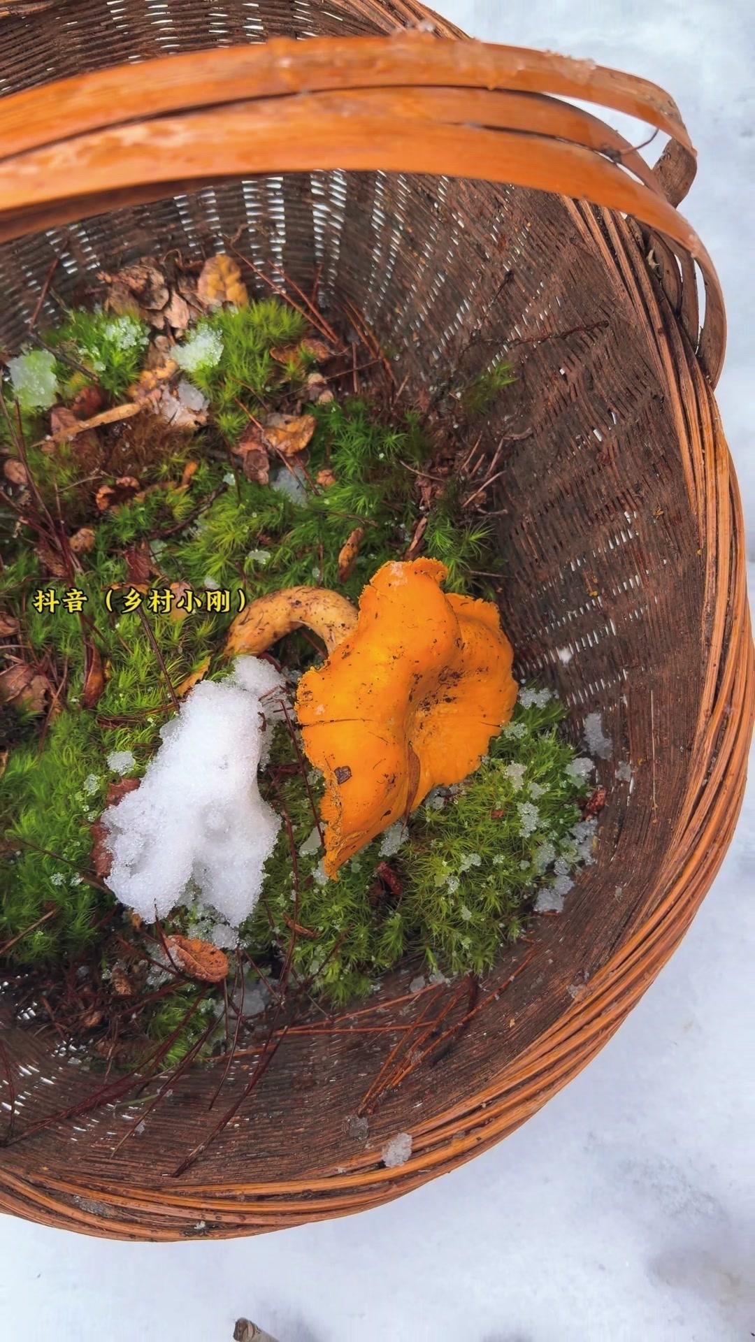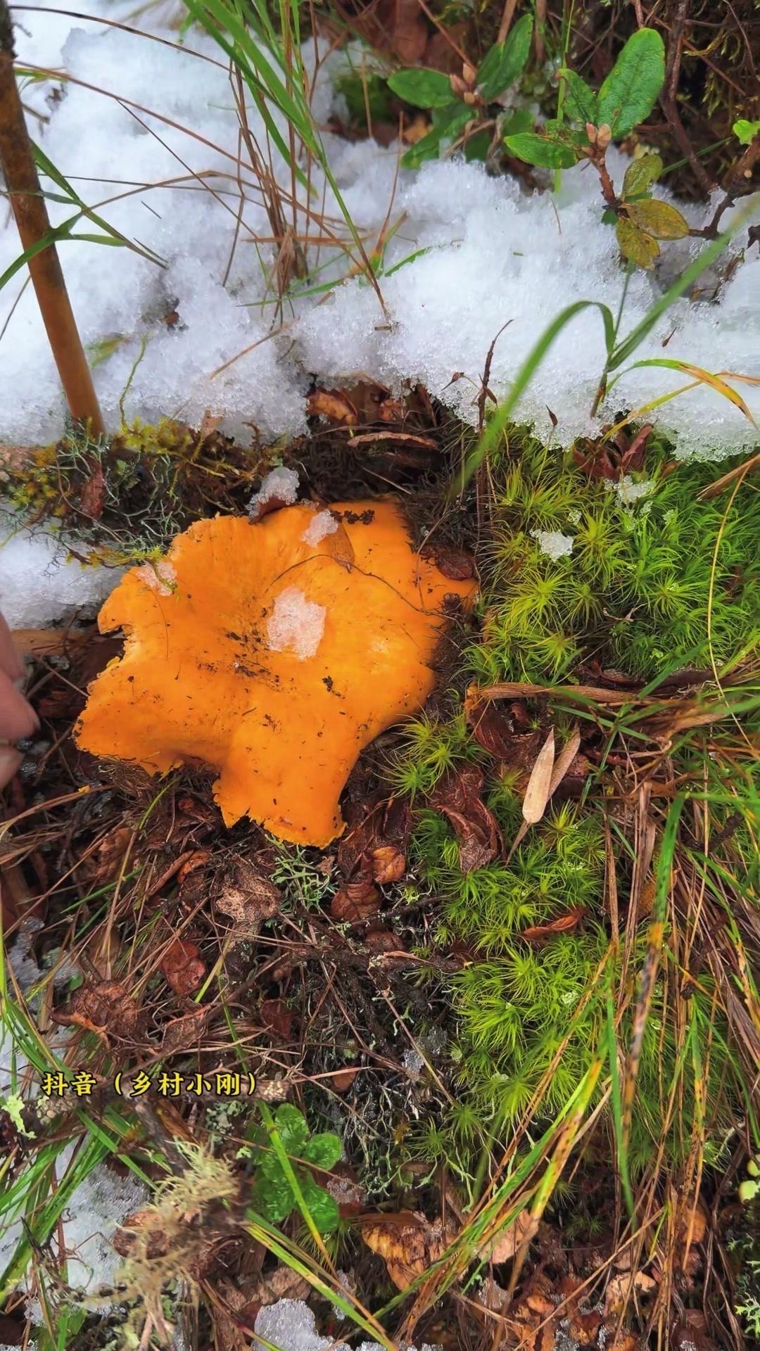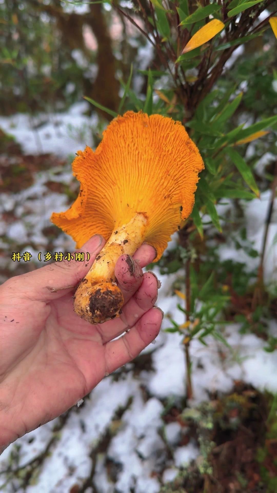 没想到吧,下雪天也能采到蘑菇!刚上山就看到好大一朵鸡油菌,简直惊喜到尖叫~