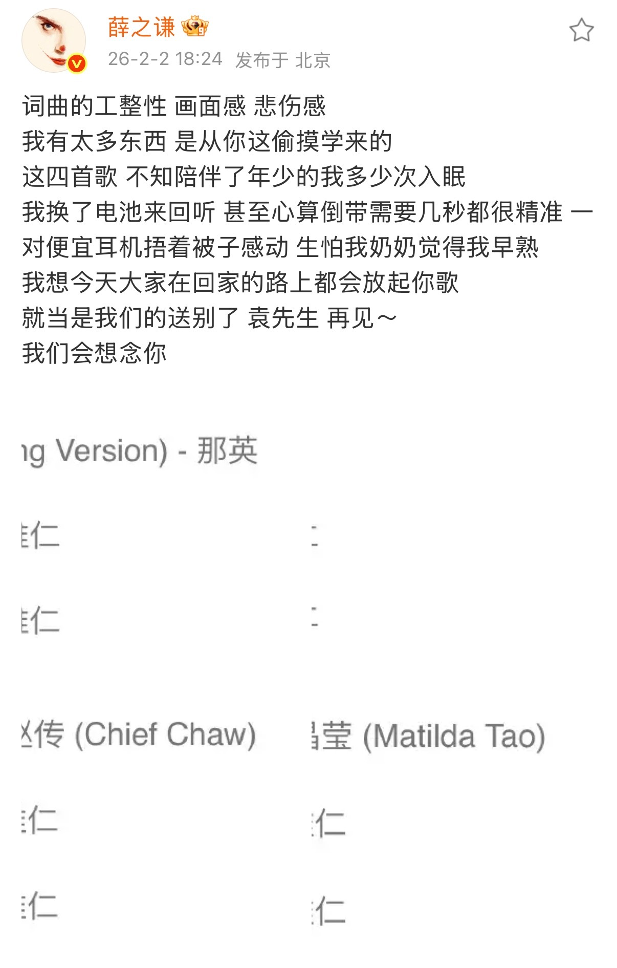 袁惟仁去世薛之谦发文悼念袁惟仁薛之谦真是性情中人,我们和老薛一样,此刻正在下班路上听袁惟仁老师的歌。我记得老薛很多年前在好声音遇到那英老师的时候,就表示小学五年级就在听《梦醒了》,是真的对老薛影响很深!