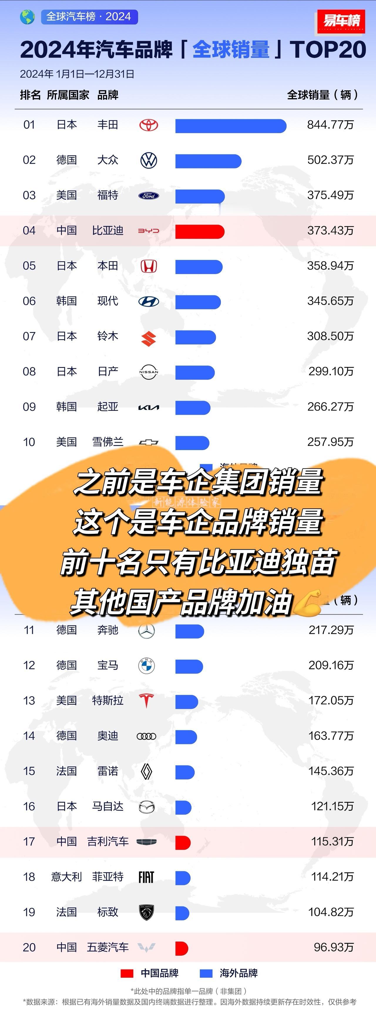 🚀比亚迪,中国汽车的全球门面!🚀 比亚迪,中国汽车的全球门面! 看完这两年的全球销量榜,真的忍不住感叹:比亚迪的格局,早就冲出亚洲了! 2024年,它是全球前十里唯一的中国品牌;2025年,依然稳坐第四,把一众百年老牌甩在身后。