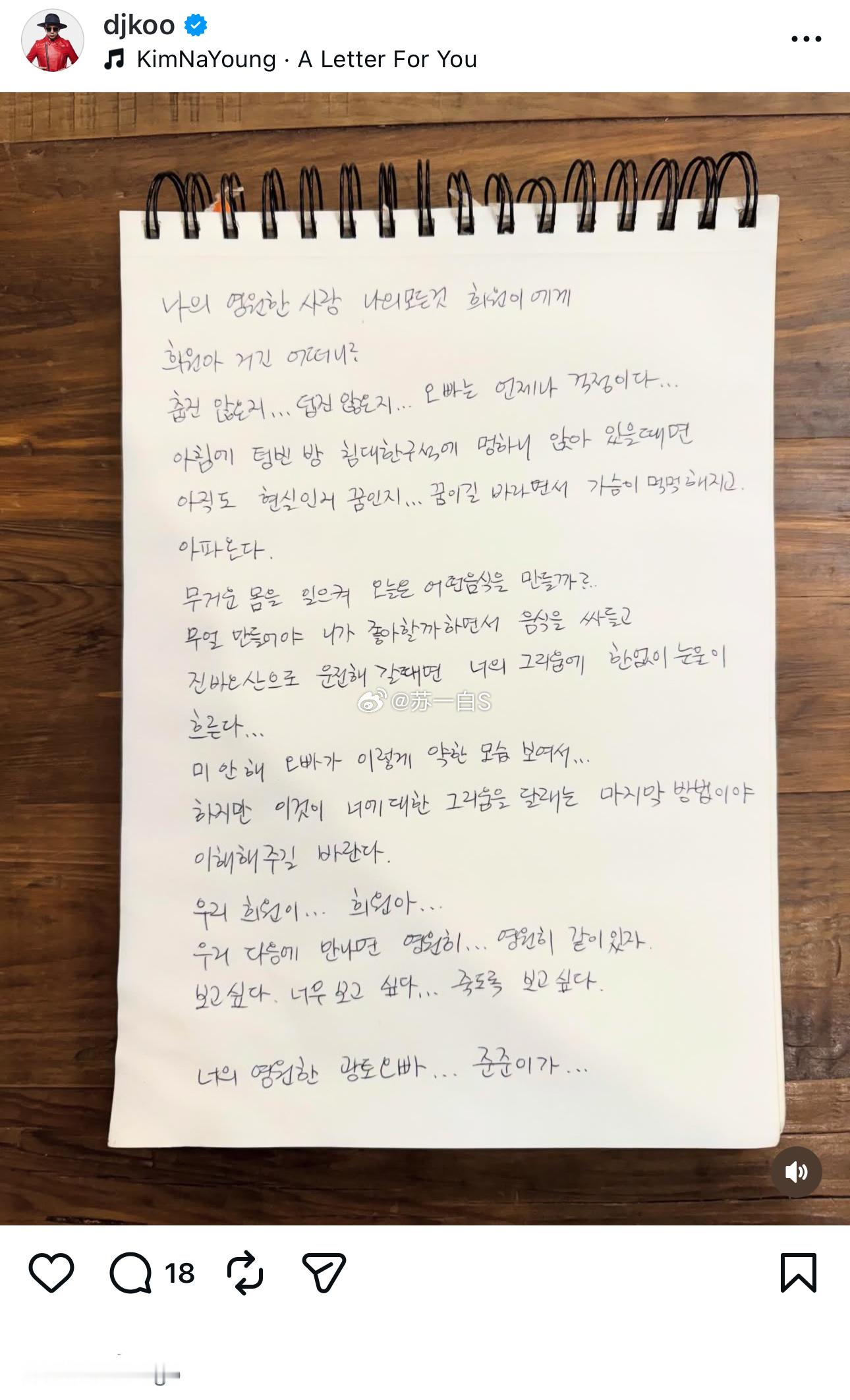 具俊晔在ins上发了一封他给大S的手写信👇具俊晔手写信怀念大S致我永远的真爱,我的全部,熙媛:
