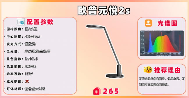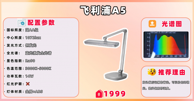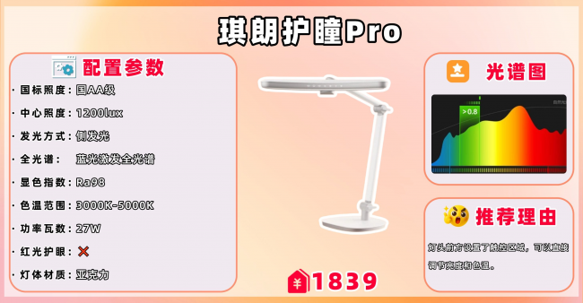 功能也比较丰富,有智能光感、睡眠夜灯和定时休息模式。而且灯头有42.1cm长,显色指数Ra98,色彩还原能力还行。不过,它是直发光设计,在强光环境下,光线层次感稍微差点。而且实测蓝光峰值在0.8左右,蓝光控制能力较弱。