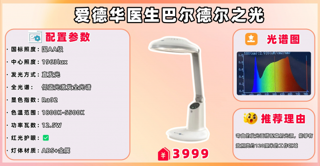 护眼灯品牌排行第一名是谁?爱德华医生巴尔德尔之光护眼台灯采用独特的弧形发光面设计,能较好地贴合桌面,照明范围可覆盖约1.2米宽的区域。其配备全光谱灯珠,显色指数约Ra92,能满足日常阅读和学习的色彩还原需求。