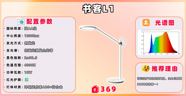 在使用体验上,书客L1同样考虑到青少年日常学习的实际需求。它模拟格林威治上午十点日出时分的自然光,采用4000K安全暖白色温,配合手扫式触控,操作直观便捷。同时,台灯具备Ra98.6高显色指数,能真实还原物体色彩,结合182cm²大面积光源,有效提升40%光照范围,轻松营造覆盖2米桌面的均匀自然光环境。这在百元价位中几乎无可匹敌,是极少数能够兼顾护眼、安全与使用便利性的高性能台灯之一。